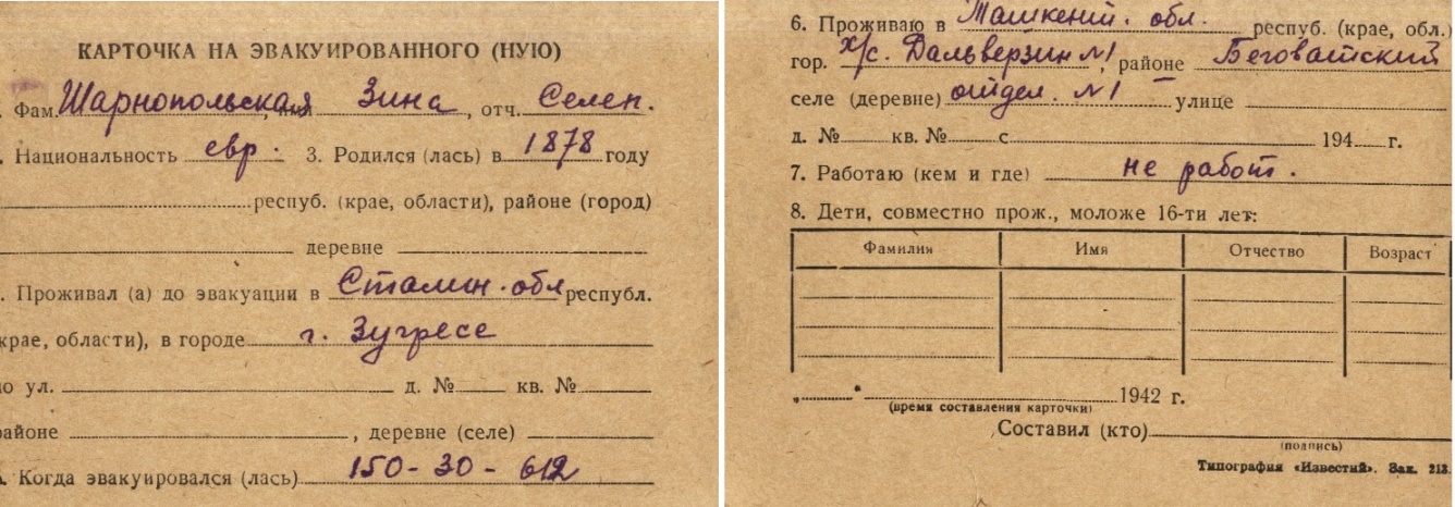 Zina Sharnopolskaya was born, 1878 to Selen. Prior to WWII she lived in Zugres, Ukraine (USSR). During the war she was in Uzbekistan (USSR). Zina was registered following the evacuation/ in the interior of the Soviet Union.