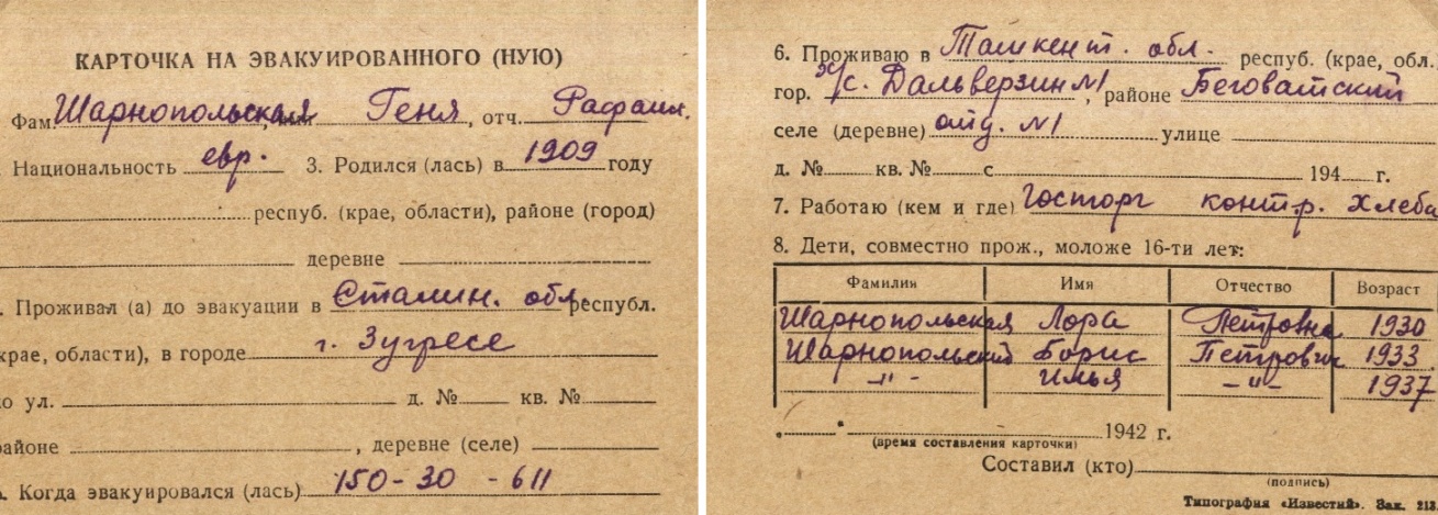 Genya Sharnopolskaya was born, 1909 to Rafail. Prior to WWII she lived in Zugres, Ukraine (USSR). During the war she was in Uzbekistan (USSR). Genya was registered following the evacuation/ in the interior of the Soviet Union.