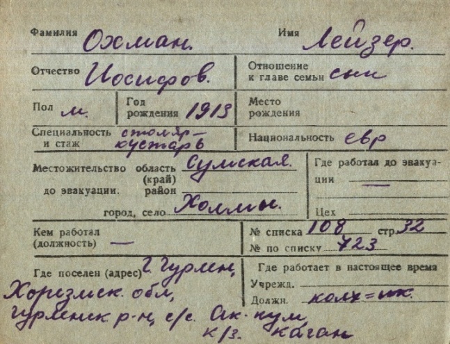 Leyzer Okhman was born, 1919 to Iosif. Prior to WWII he lived in Kholmy, Ukraine (USSR). During the war he was in Uzbekistan (USSR). Leyzer was registered following the evacuation/ in the interior of the Soviet Union.