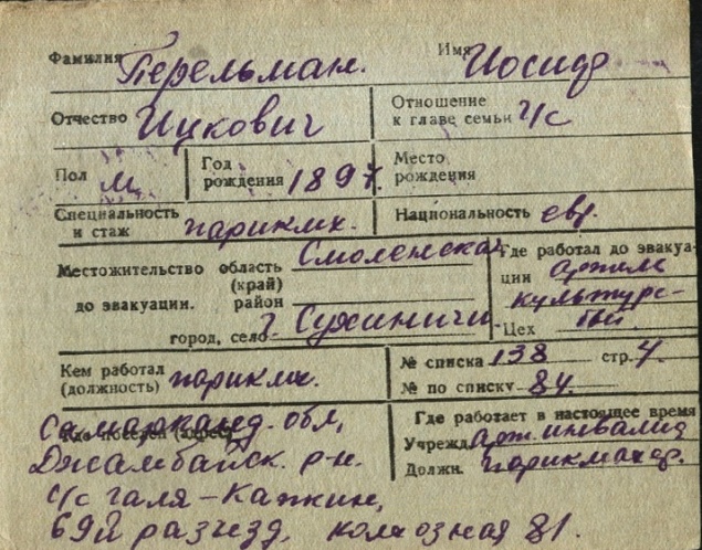 Iosif Perelman was born, 1897 to Itzko. Prior to WWII he lived in Sukhinichi, Russia (USSR). During the war he was in Uzbekistan (USSR). Iosif was registered following the evacuation/ in the interior of the Soviet Union.