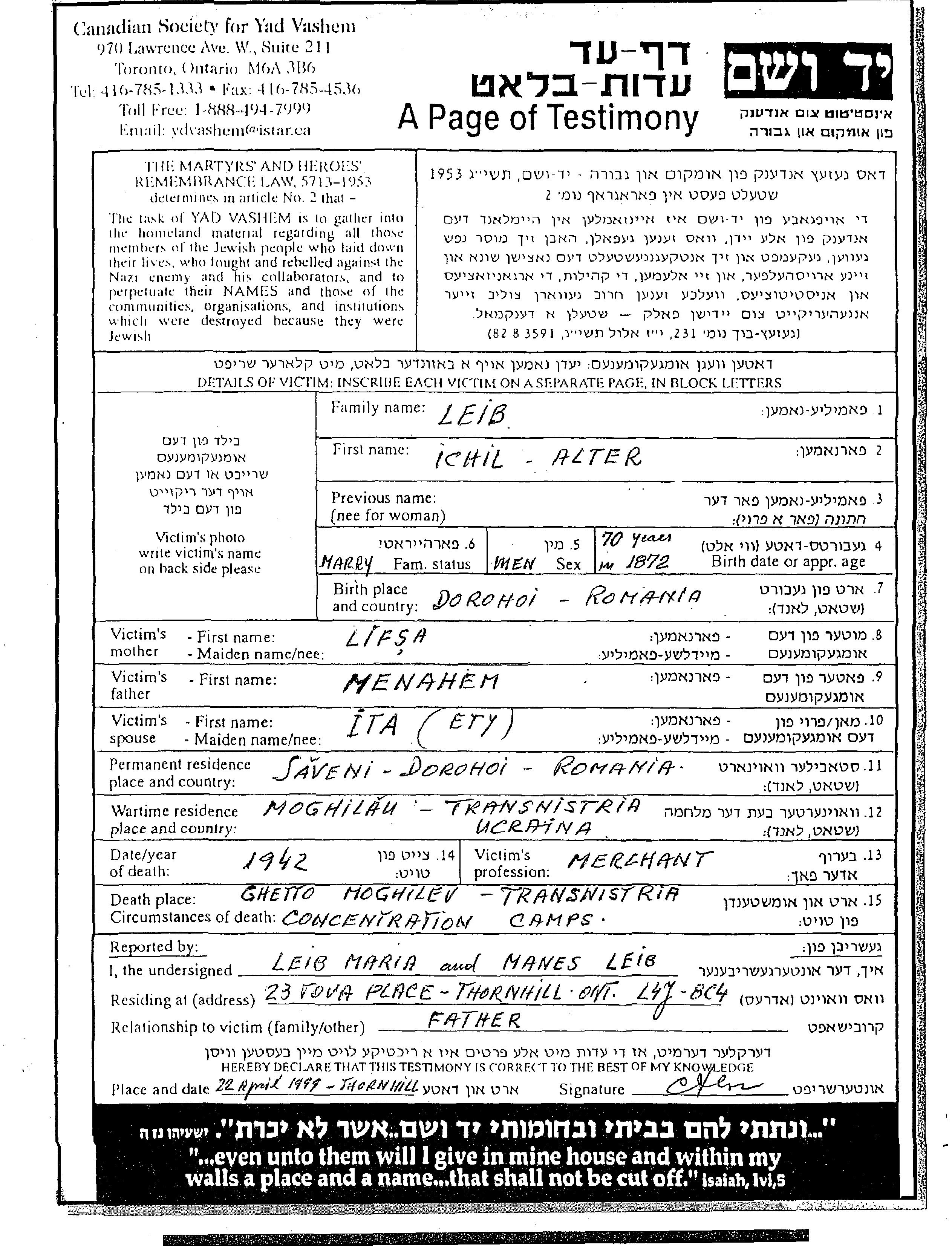 Ichil Alter Leib was born in Dorohoi, Romania, 1872 to Menahem and Lifsa. He was a merchant and married to Ita. Prior to WWII he lived in Saveni, Romania. During the war he was in Mogelov, Ukraine (USSR).