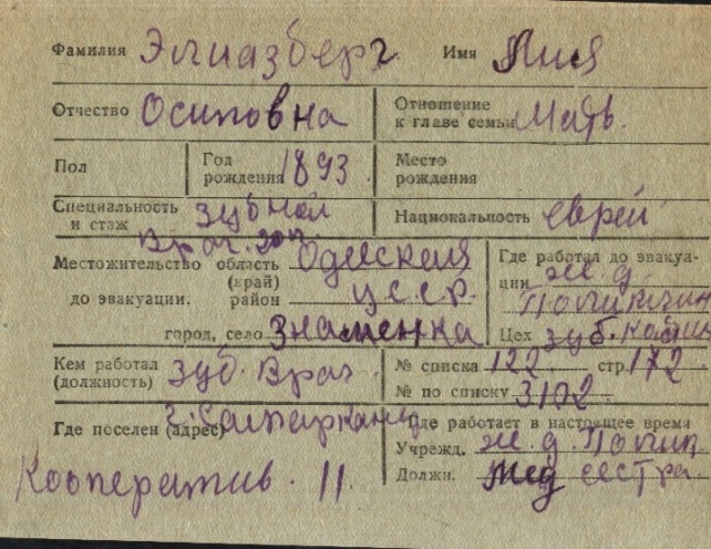 Liya Eliazberg was born, 1893 to Osip. Prior to WWII she lived in Znamenka, Ukraine (USSR). During the war she was in Uzbekistan (USSR). Liya was registered following the evacuation/ in the interior of the Soviet Union.