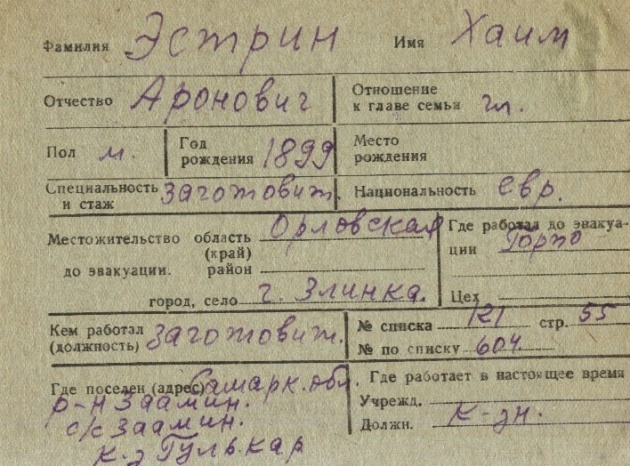 Estrin Khaim 1899 Zlynka, Russia (USSR) List of evacuated persons