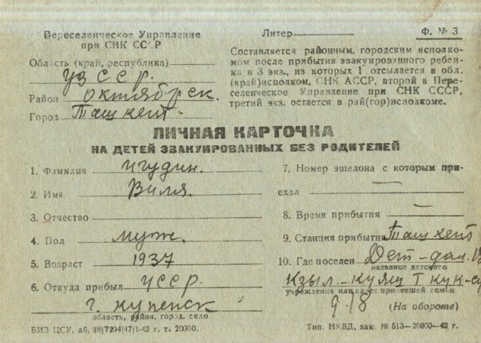 Vilya Igudin was born, 1937. He was child. Prior to WWII he lived in Kupyansk, Ukraine (USSR). During the war he was in Uzbekistan (USSR). Vilya was registered following the evacuation/ in the interior of the Soviet Union.