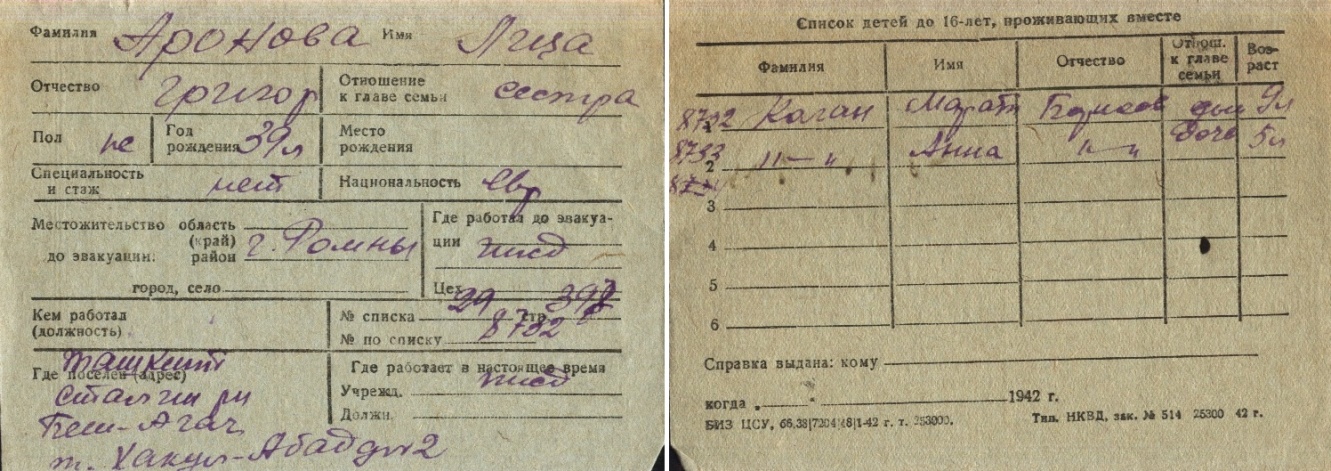 Liza Aronova was born to Grigor. Prior to WWII she lived in Romny, Ukraine (USSR). During the war she was in Uzbekistan (USSR). Liza was registered following the evacuation/ in the interior of the Soviet Union.