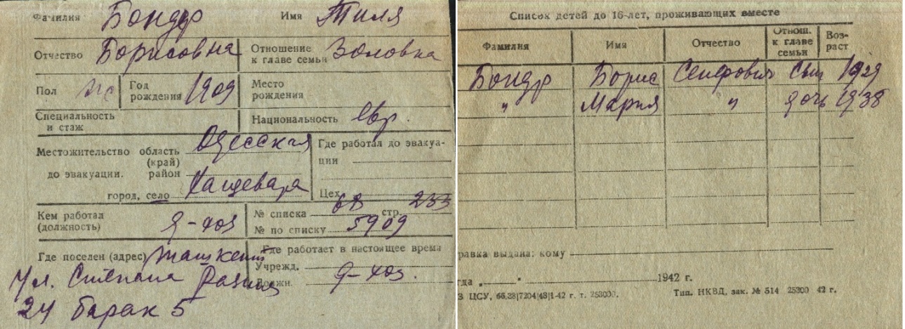 Tilya Bonder was born, 1909 to Boris. Prior to WWII she lived in Khashchevato, Ukraine (USSR). During the war she was in Uzbekistan (USSR). Tilya was registered following the evacuation/ in the interior of the Soviet Union.