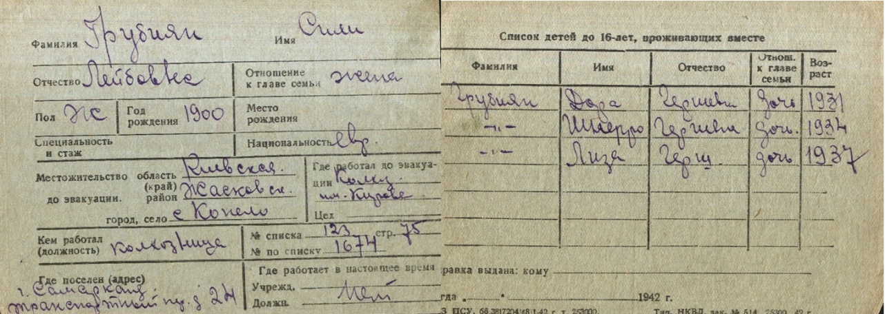 Sili Grubiyan was born, 1900 to Leyb. Prior to WWII she lived in Konela, Ukraine (USSR). During the war she was in Uzbekistan (USSR). Sili was registered following the evacuation/ in the interior of the Soviet Union.