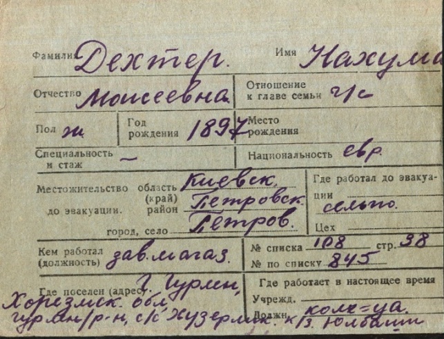 Nakhuma Dekhter was born, 1897 to Moisey. Prior to WWII she lived in Petrovskogo Imeni, Ukraine (USSR). During the war she was in Uzbekistan (USSR). Nakhuma was registered following the evacuation/ in the interior of the Soviet Union.