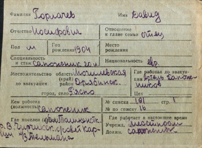 David Gorlachev was born, 1904 to Iosif. Prior to WWII he lived in Ryasna, Belorussia (USSR). During the war he was in Uzbekistan (USSR). David was registered following the evacuation/ in the interior of the Soviet Union.