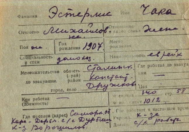Chaka Esterlis was born, 1907 to Mikhail. Prior to WWII she lived in Druzhkovka, Ukraine (USSR). During the war she was in Uzbekistan (USSR). Chaka was registered following the evacuation/ in the interior of the Soviet Union.