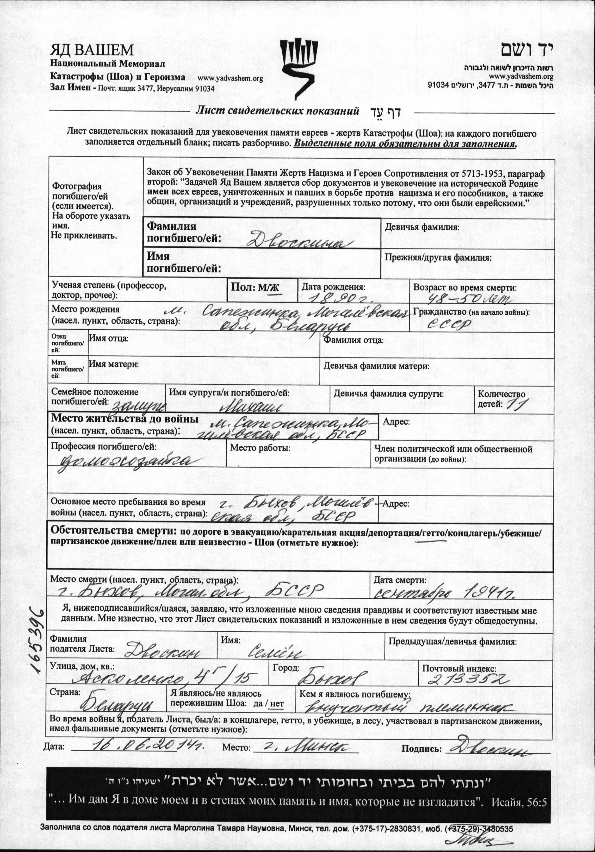 First name unknown Dvoskina was born in Sapezhinka, Belorussia (USSR), 1890. She was a housewife and married to Mikhail. Prior to WWII she lived in Sapezhinka, Belorussia (USSR). During the war she was in Bykhov, Belorussia (USSR). She was murdered in the Shoah. Place of death: Bykhov, Belorussia (USSR), 09/1941.