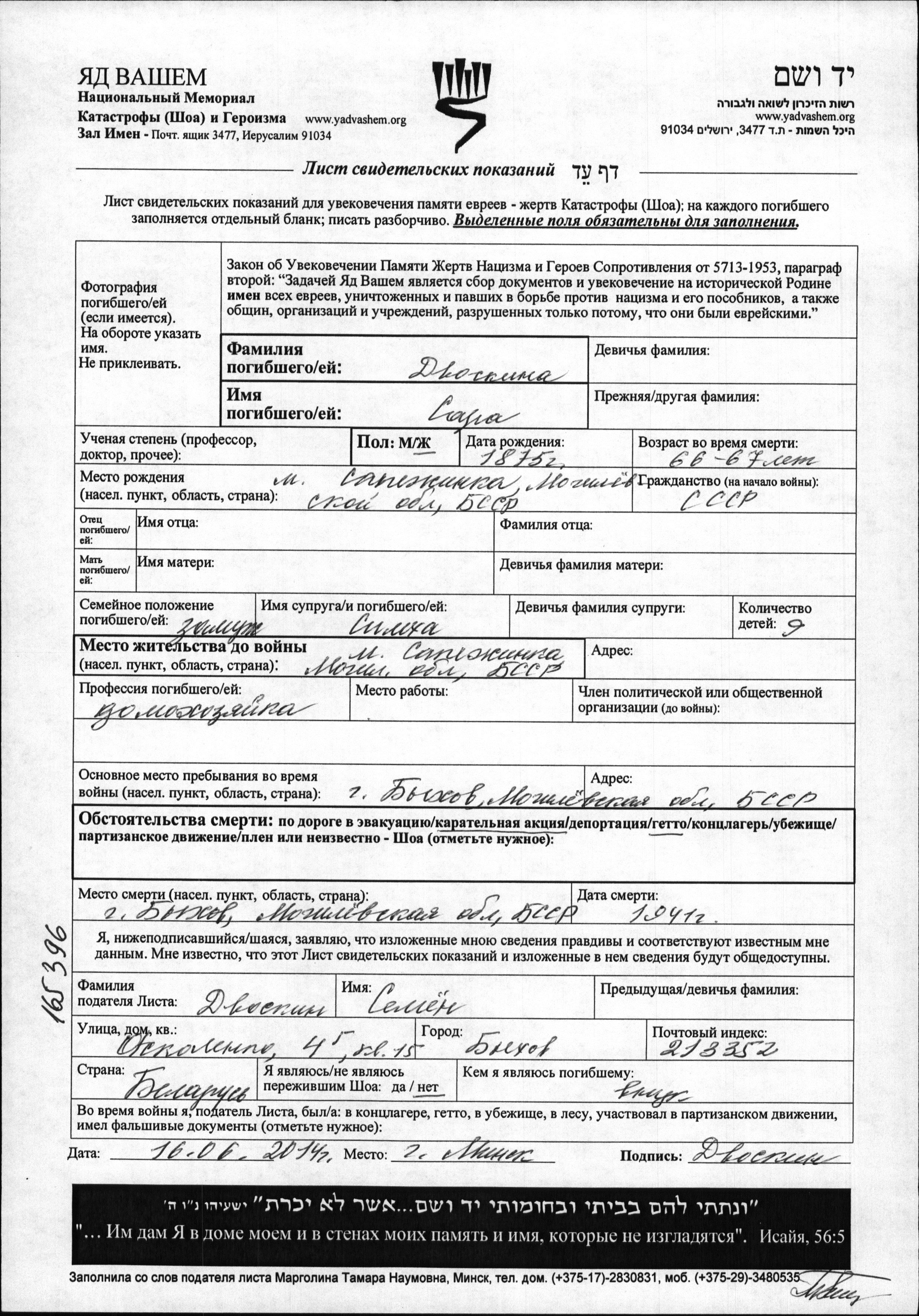 Sara Dvoskina was born in Sapezhinka, Belorussia (USSR), 1875. She was a housewife and married to Simkha. Prior to WWII she lived in Sapezhinka, Belorussia (USSR). During the war she was in Bykhov, Belorussia (USSR). Sara was murdered in the Shoah. Place of death: Bykhov, Belorussia (USSR), 1941.