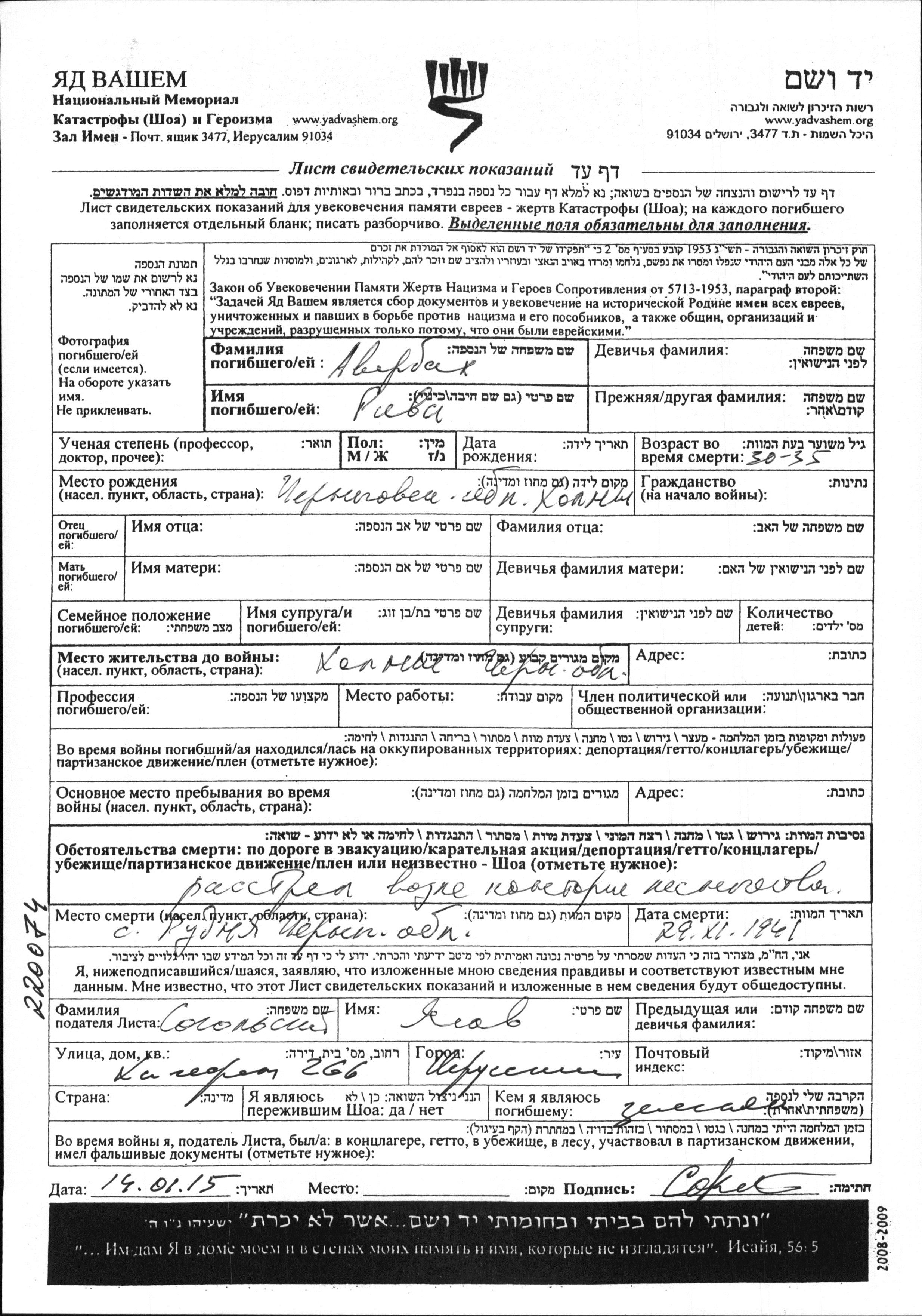 Riva Averbakh was born in Kholmy, Ukraine (USSR). Prior to WWII she lived in Kholmy, Ukraine (USSR). Riva was murdered in the Shoah. Place of death: Rudnya, Ukraine (USSR), 29/11/1941.