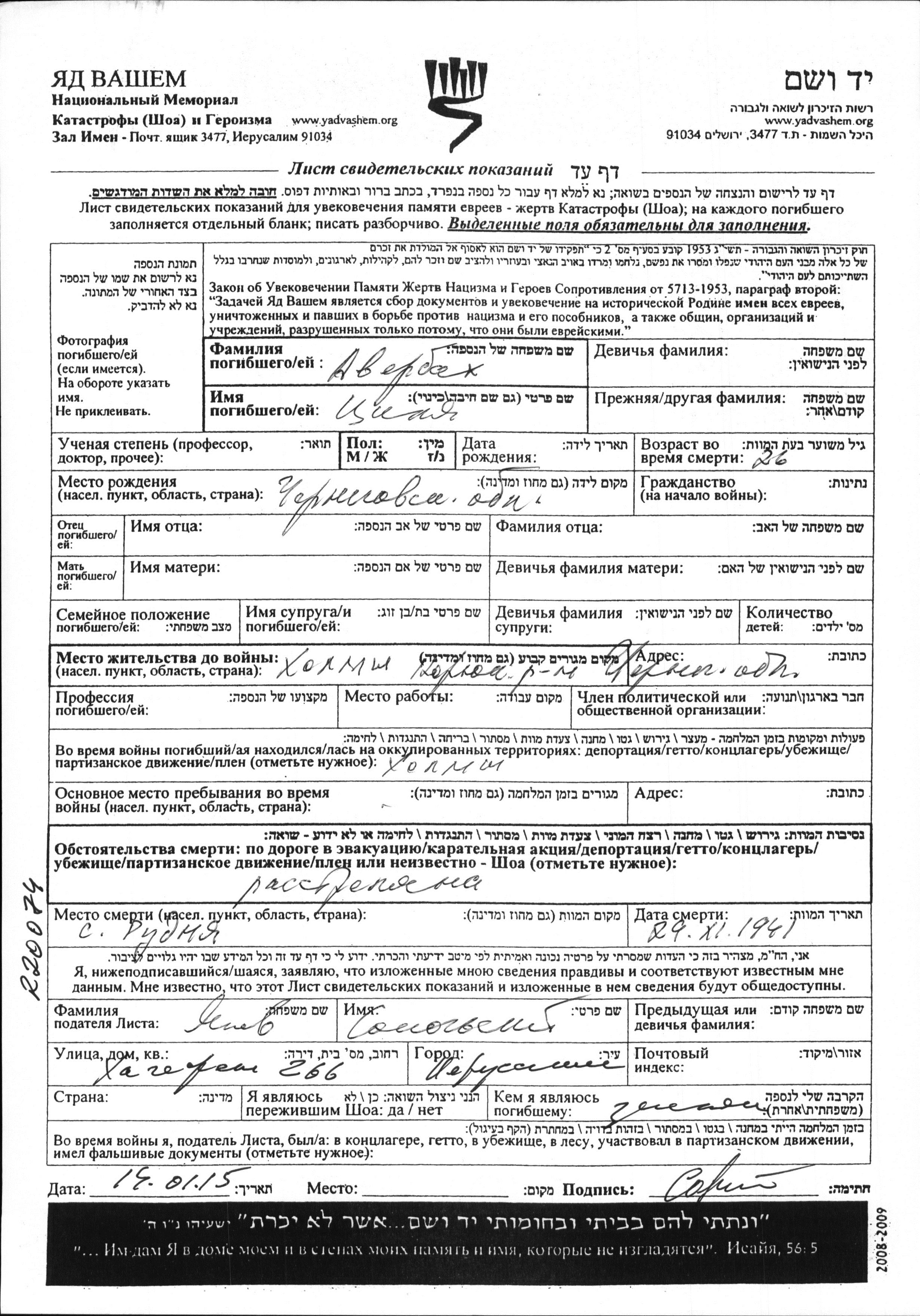 Tzilya Averbakh was born in Chernigov, Ukraine (USSR). Prior to WWII she lived in Kholmy, Ukraine (USSR). During the war she was in Kholmy, Ukraine (USSR). Tzilya was murdered in the Shoah. Place of death: Rudnya, Ukraine (USSR), 29/11/1941.