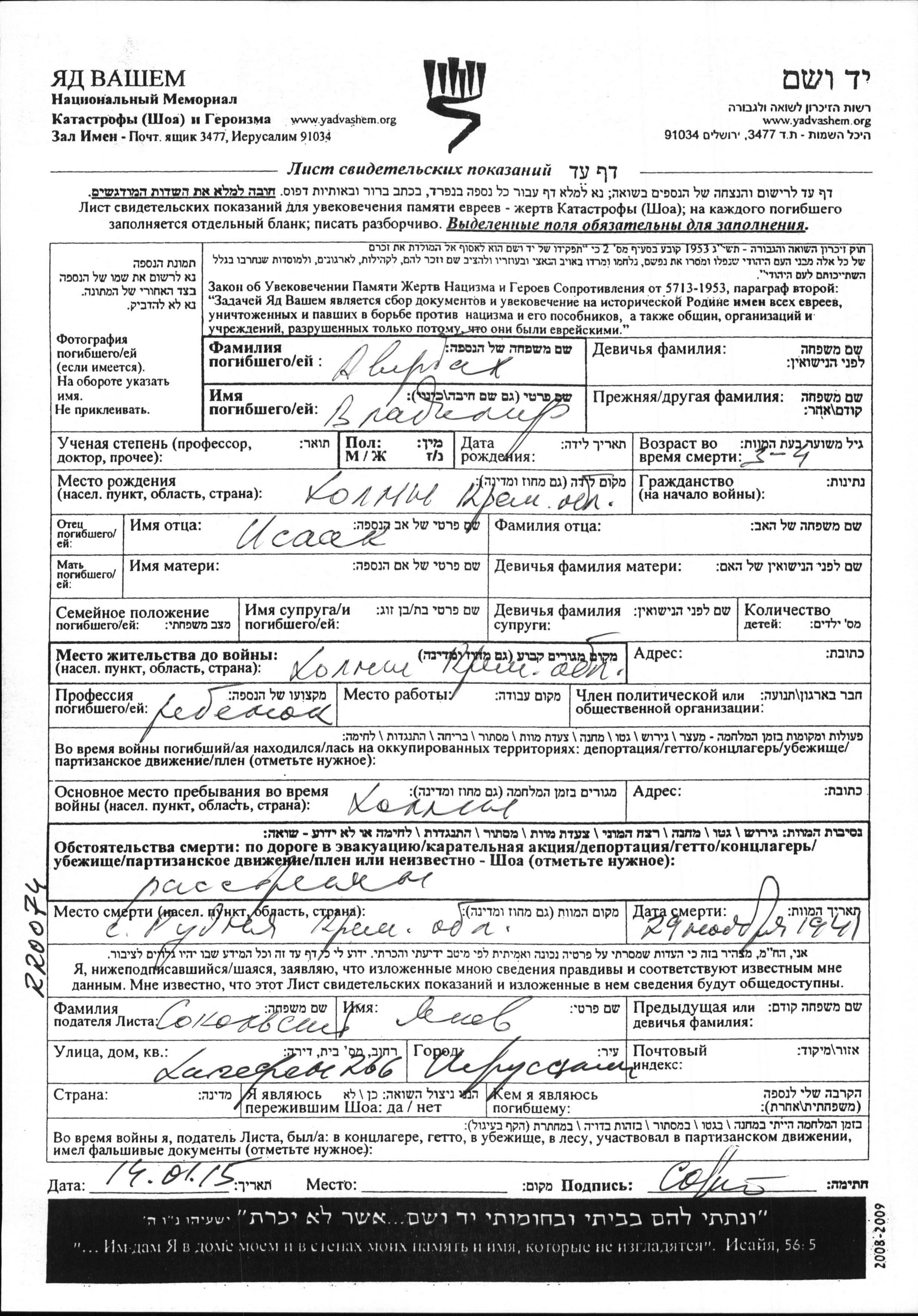 Vladimir Averbakh was born in Kholmy, Ukraine (USSR) to Isaak. He was child. Prior to WWII he lived in Kholmy, Ukraine (USSR). During the war he was in Kholmy, Ukraine (USSR). Vladimir was murdered in the Shoah. Place of death: Rudnya, Ukraine (USSR), 29/11/1941.