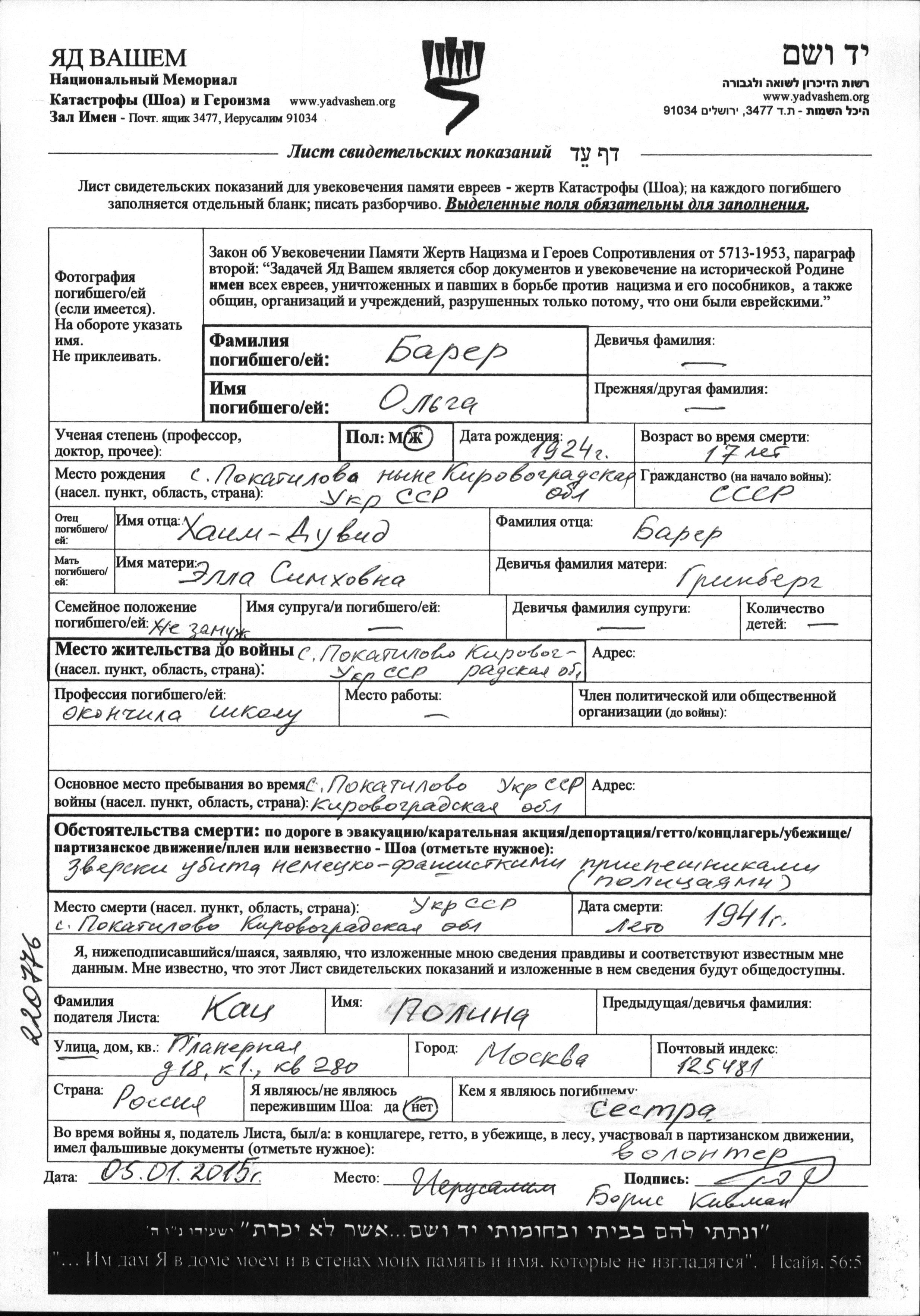 Olga Barer was born in Pokatilovo, Ukraine (USSR), 1924 to Khayim Duvid and Ella nee Grinberg. She was a vypusknitza shkoly and teenager. Prior to WWII she lived in Pokatilovo, Ukraine (USSR). During the war she was in Pokatilovo, Ukraine (USSR). Olga was murdered in the Shoah. Place of death: Pokatilovo, Ukraine (USSR), 01/01/1941.
