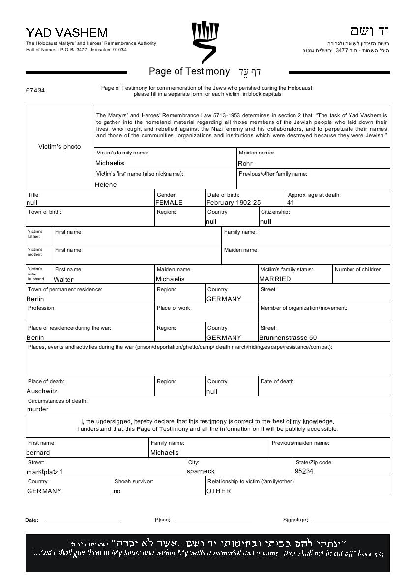 Helene Michaelis nee Rohr was born, 1902. She was married to Walter nee Michaelis. Prior to WWII she lived in Berlin, Germany. During the war she was in Berlin, Germany. Helene was murdered in the Shoah. Place of death: Auschwitz, Poland.