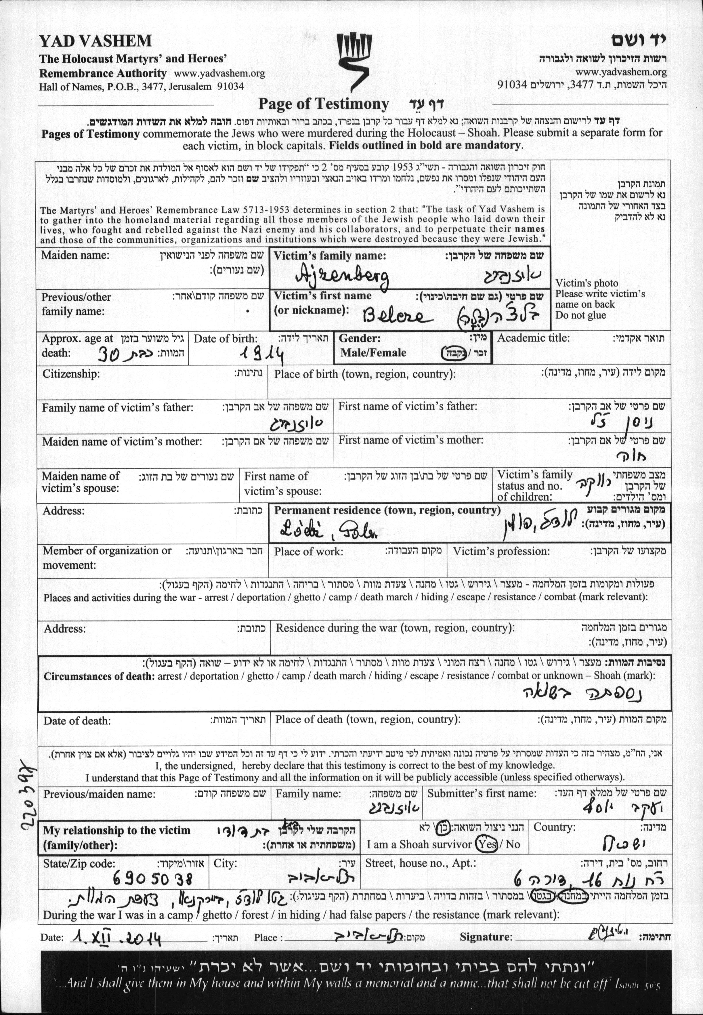 Yad Vashem - Pages of Testimony Names Memorial Collection