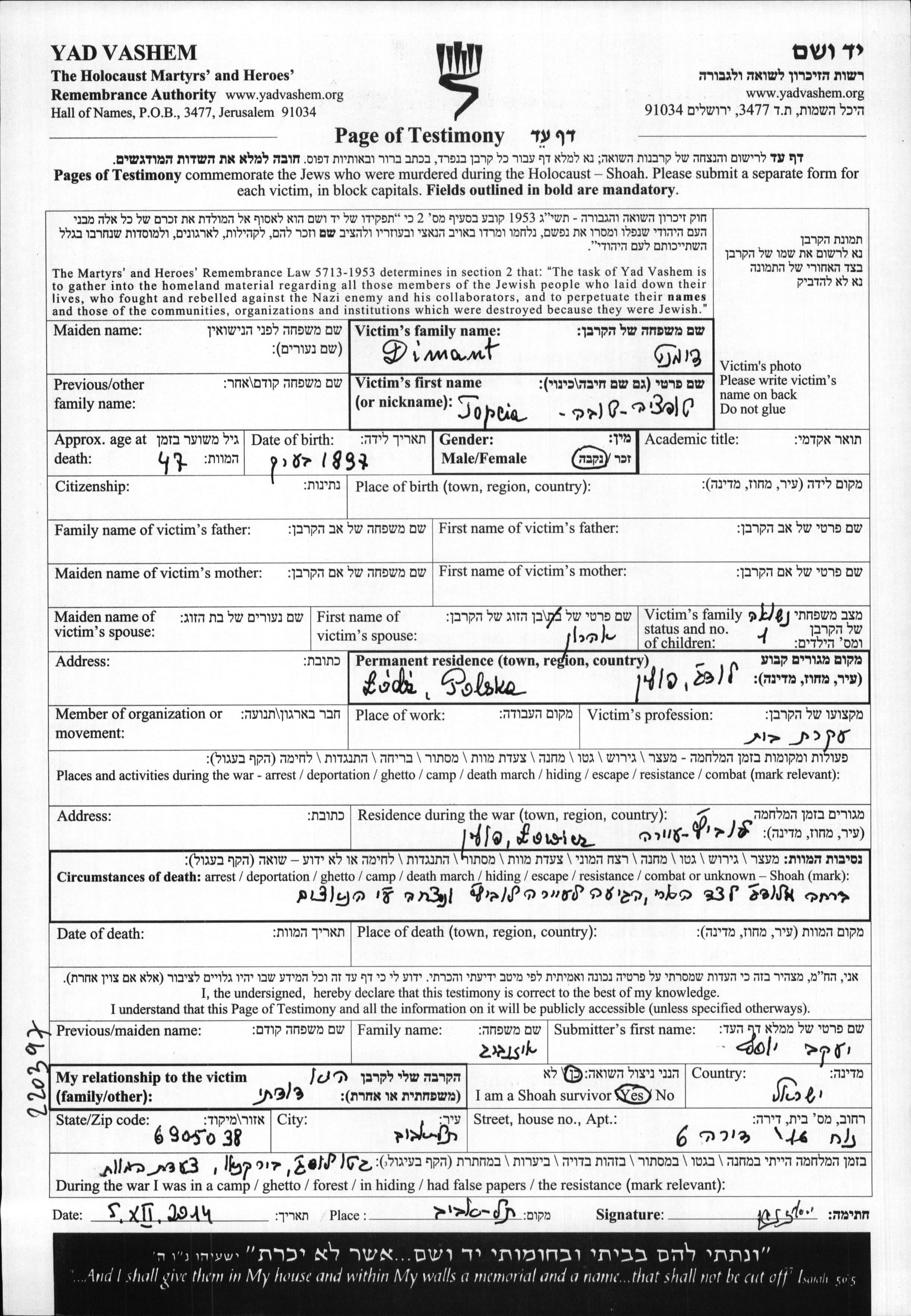 Topcia Dimant was born, 1897. She was a housewife and married to Aharon. Prior to WWII she lived in Lodz, Poland. During the war she was in Lowicz, Poland. Topcia was murdered in the Shoah. Place of death: Lowicz, Poland.