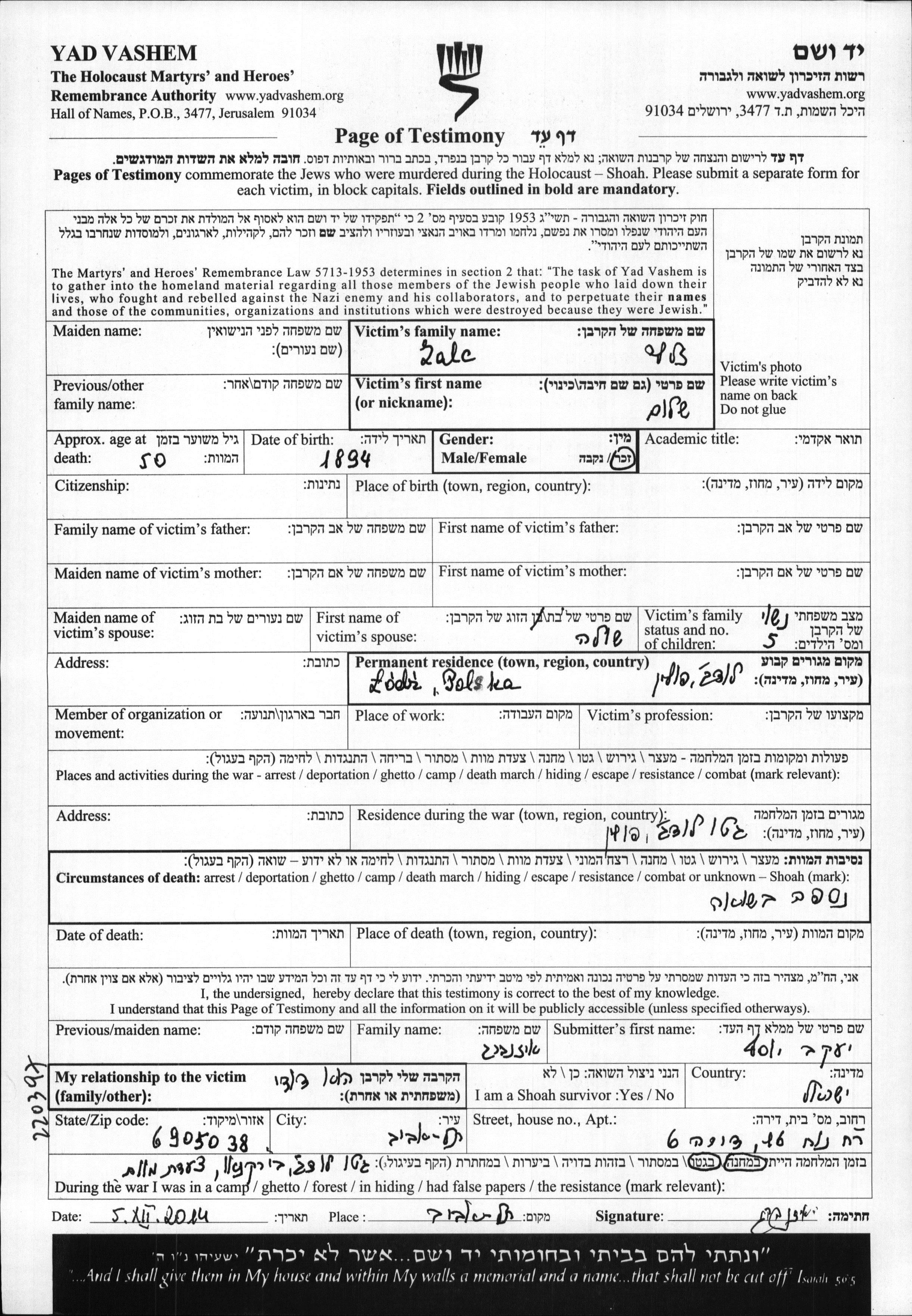 Zalc Shalom 1894 Lodz, Poland Page of Testimony