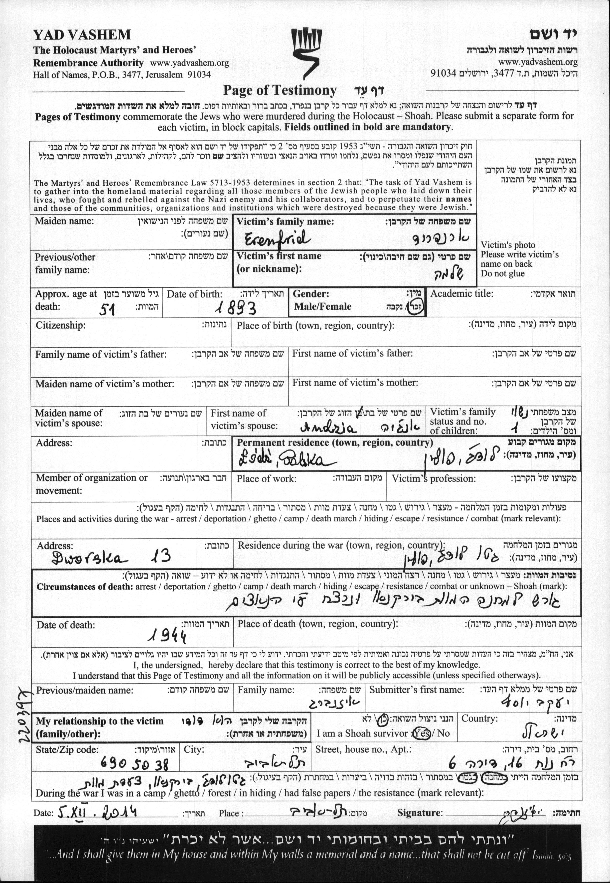 Shlomo Erenfrid was born, 1893. He was married to Andzia. Prior to WWII he lived in Lodz, Poland. During the war he was in Lodz, Poland. Shlomo was murdered in the Shoah. Place of death: Birkenau, Poland, 1944.