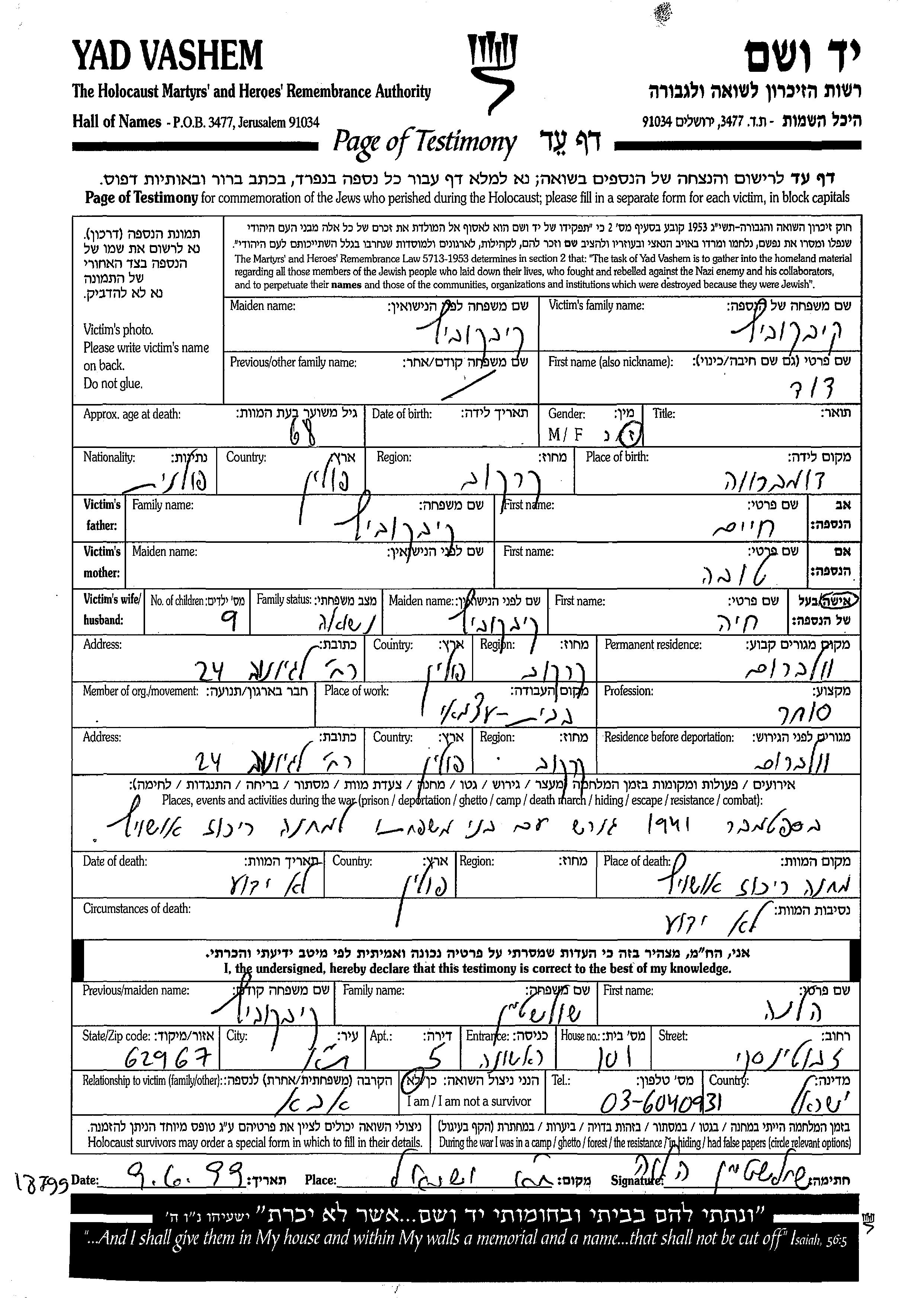 Yad Vashem - Pages of Testimony Names Memorial Collection