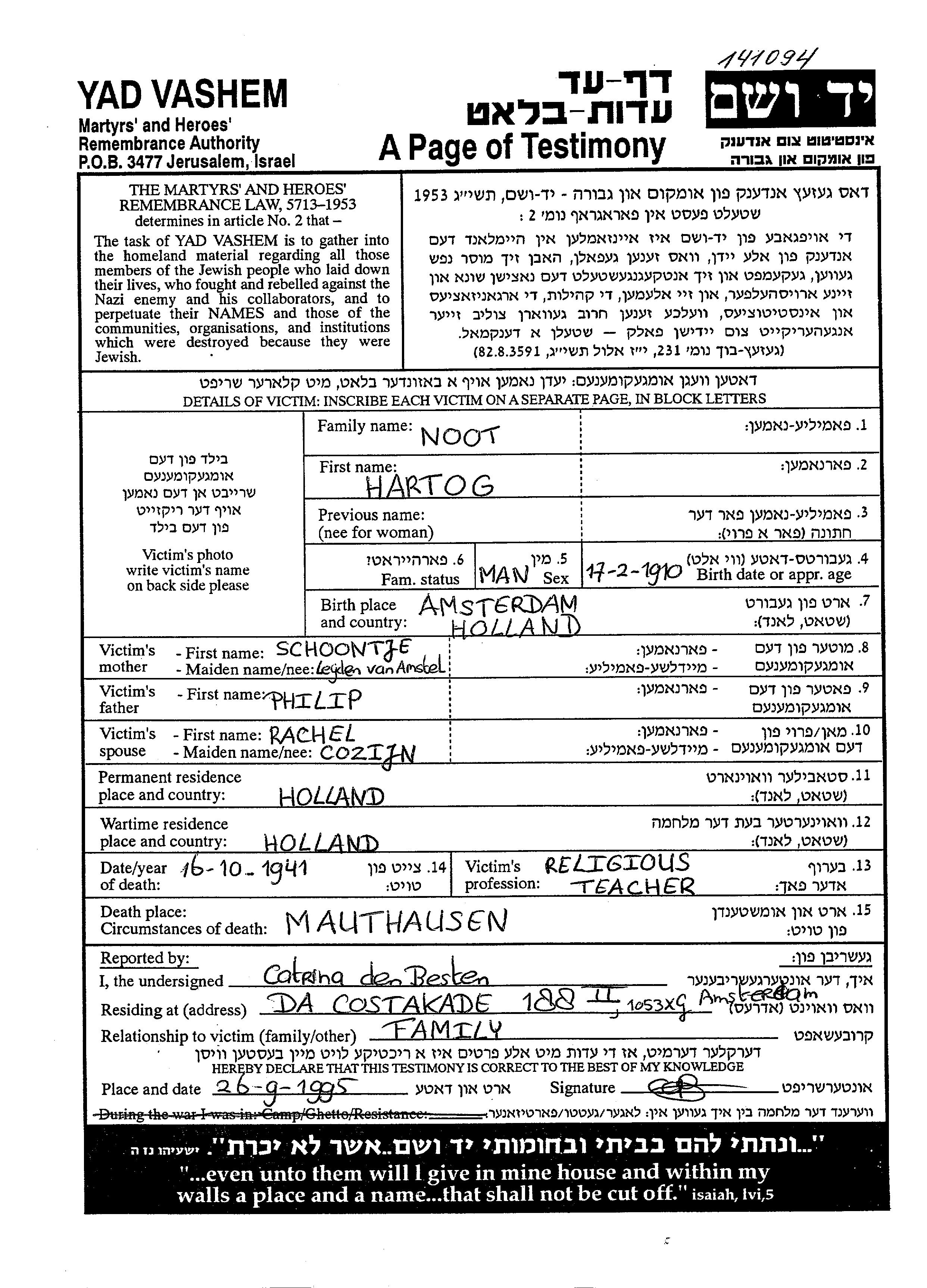 | Noot | Hertog | 1910 | The Netherlands | Page of Testimony |