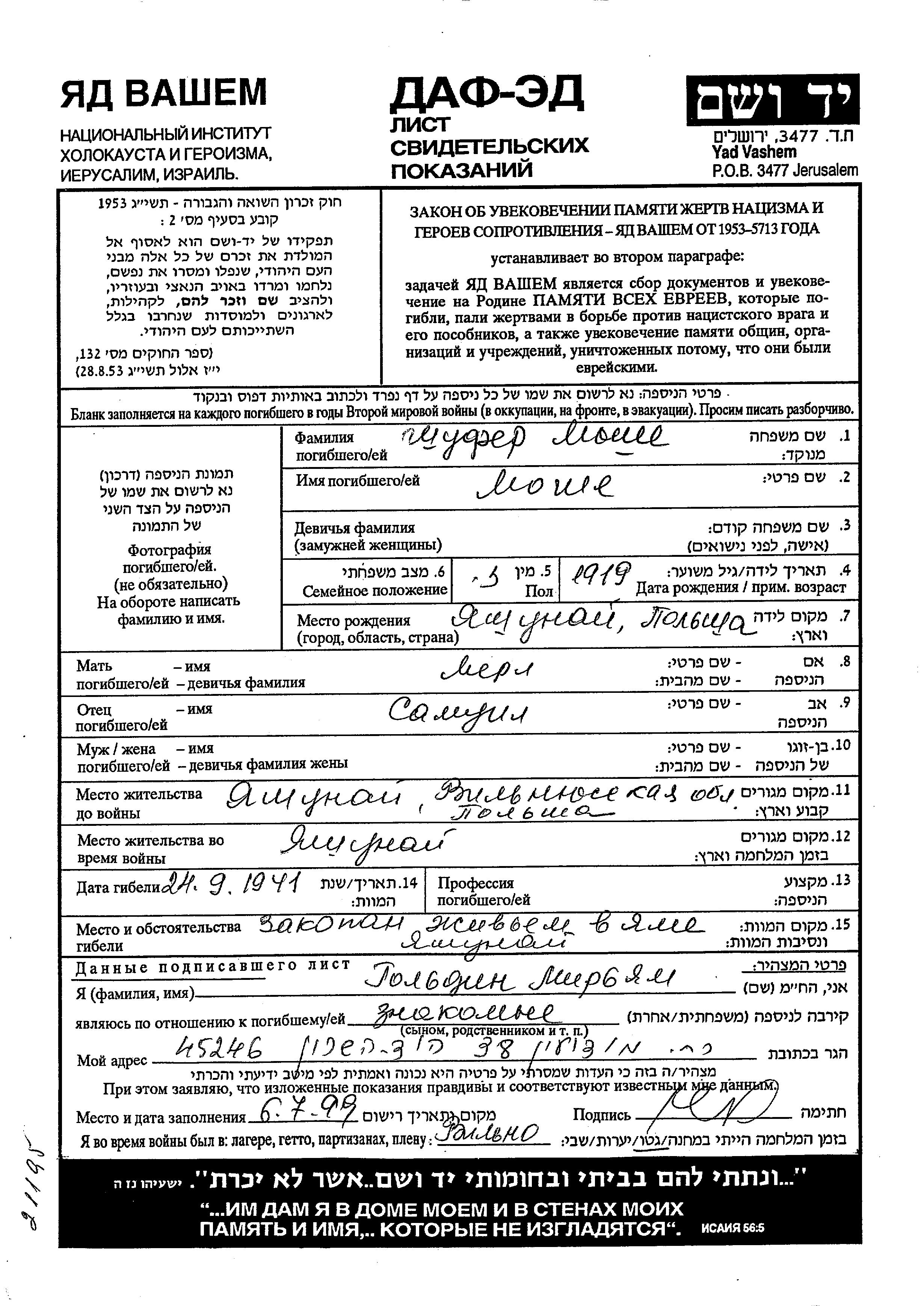 Moshe Shufer was born in Jaszuny, Poland, 1919 to Samuil and Merl. Prior to WWII he lived in Jaszuny, Poland. During the war he was in Jaszuny, Poland. Moshe was murdered in the Shoah. Place of death: Jaszuny, Poland, 24/09/1941.