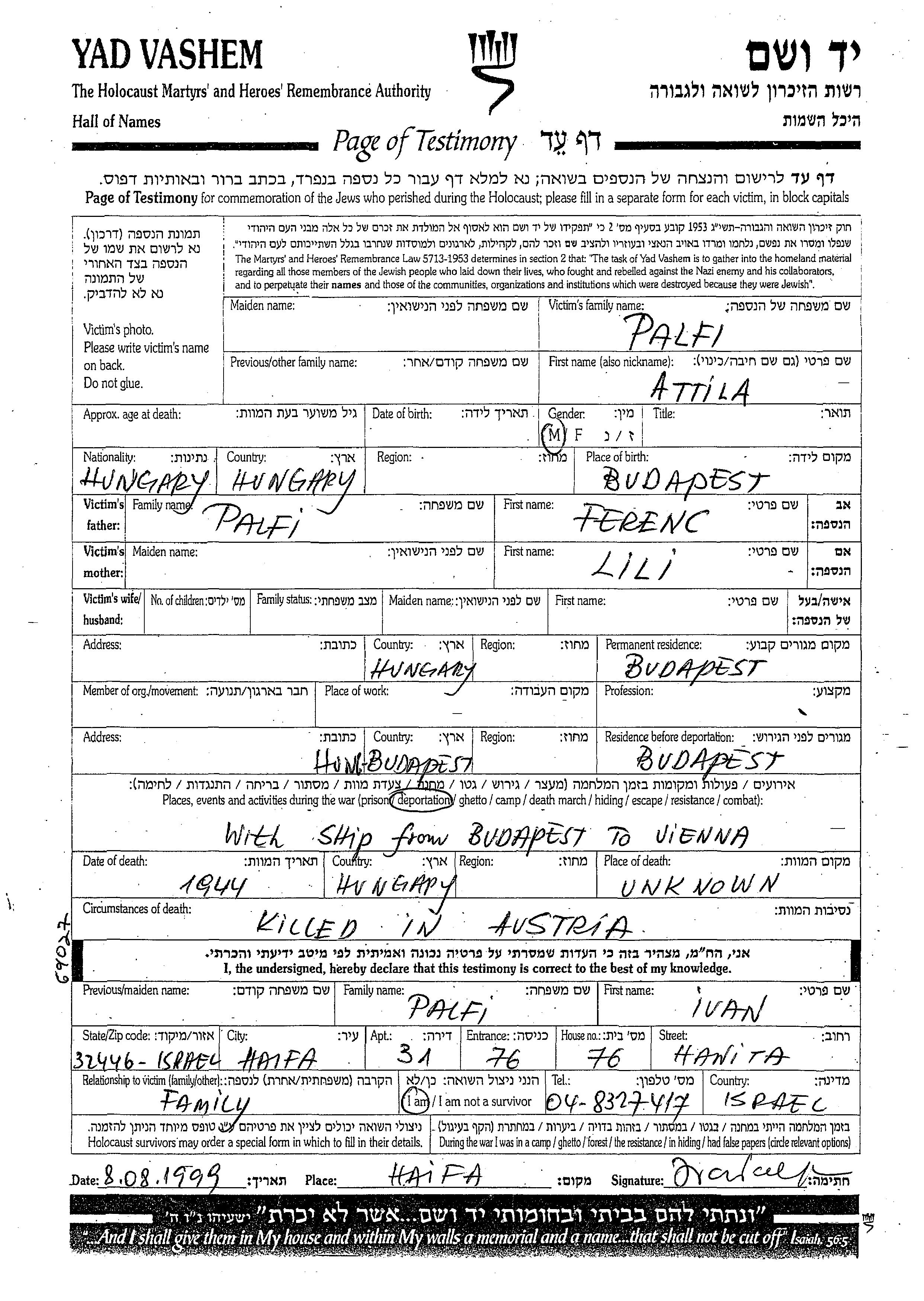 Palfi Attila Budapest, Hungary Page of Testimony