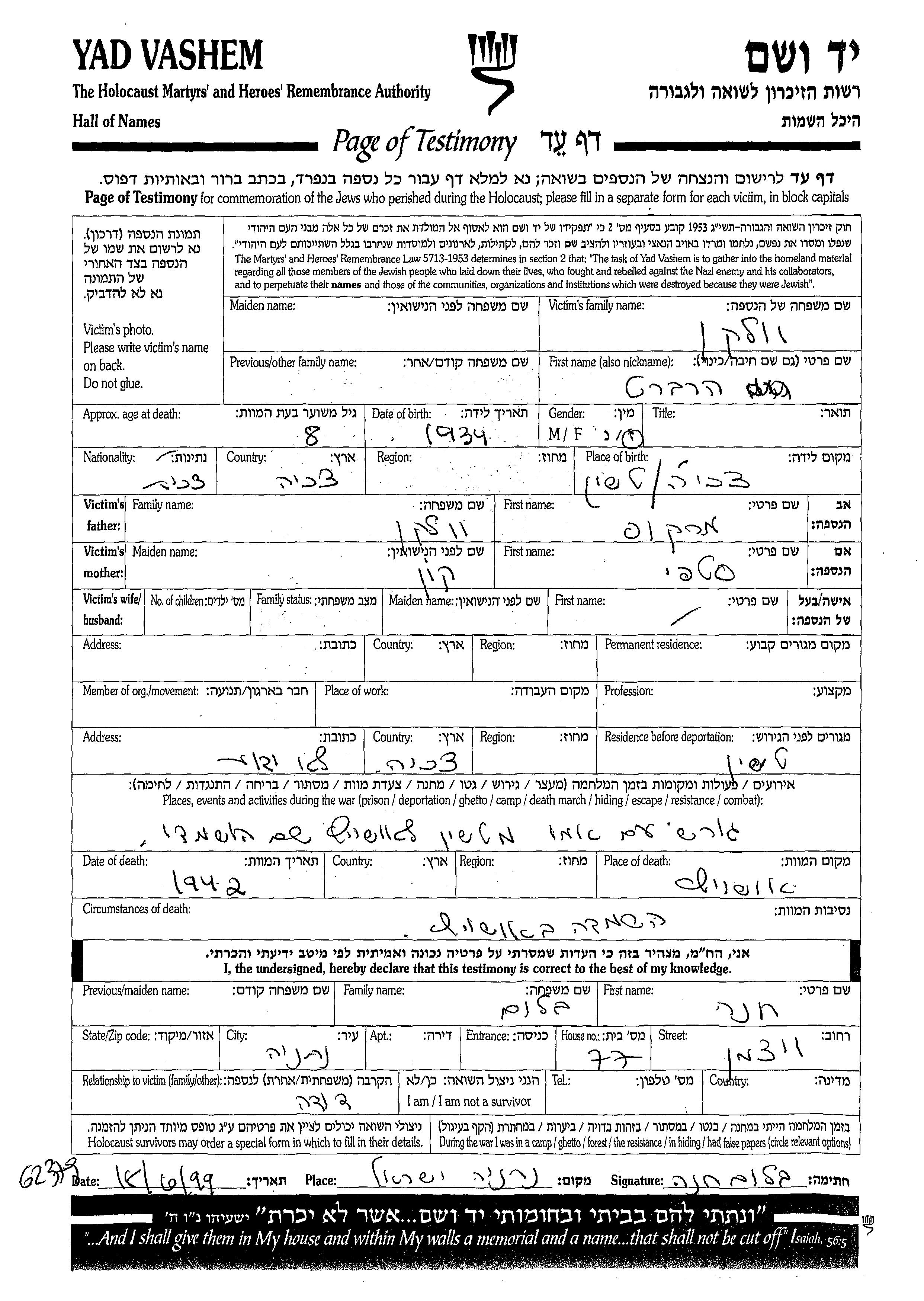 Yad Vashem - Pages of Testimony Names Memorial Collection