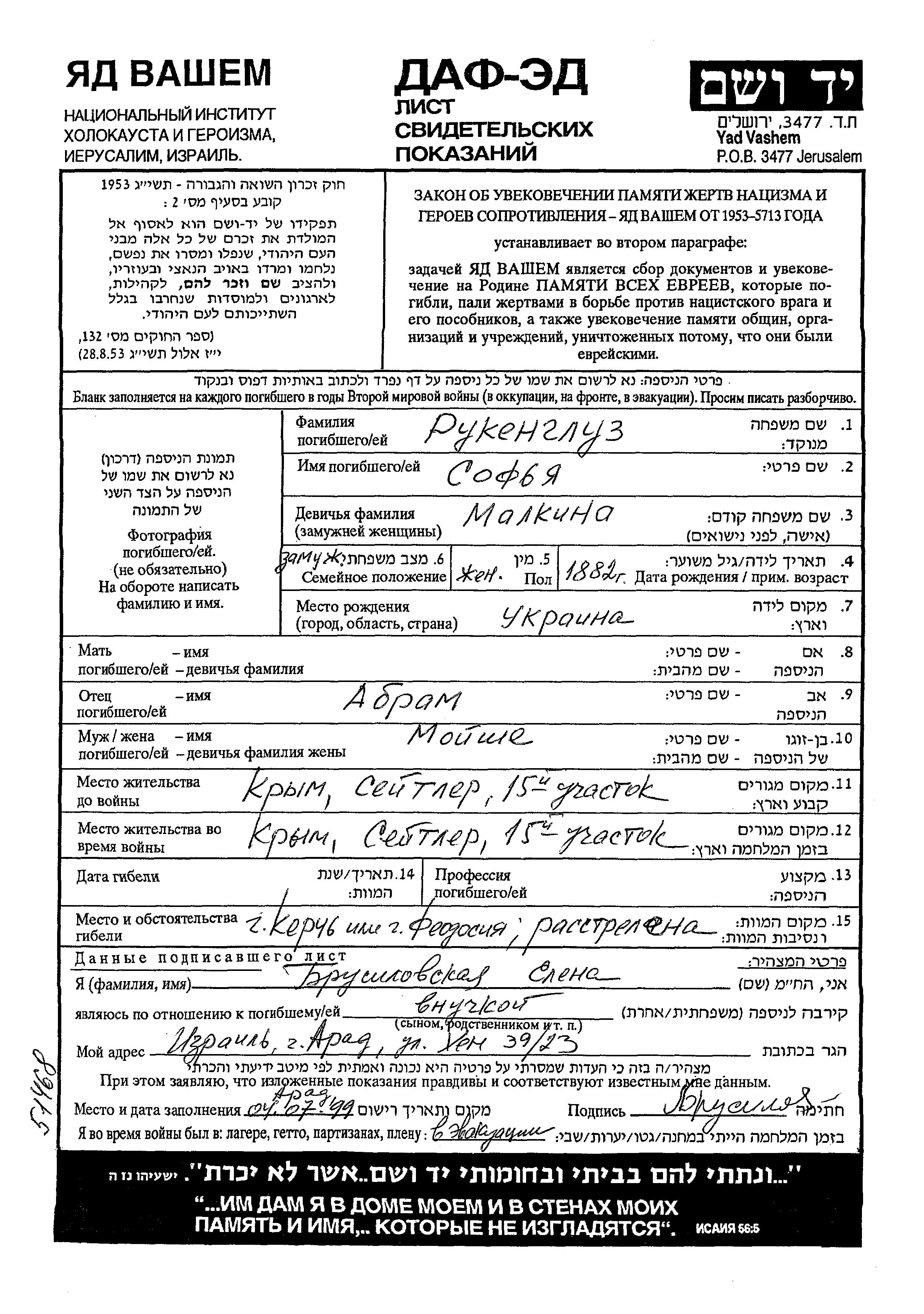 Rukengluz Sofia 1882 Seitler, Russia (USSR) Page of Testimony