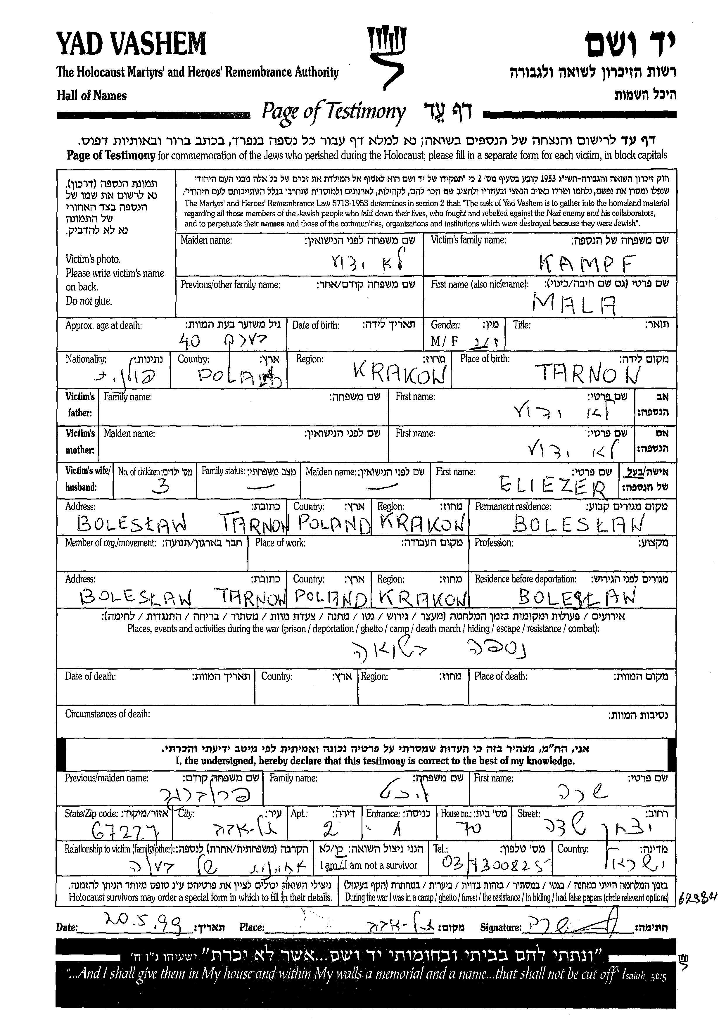 Kampf Mala Boleslaw, Poland Page of Testimony