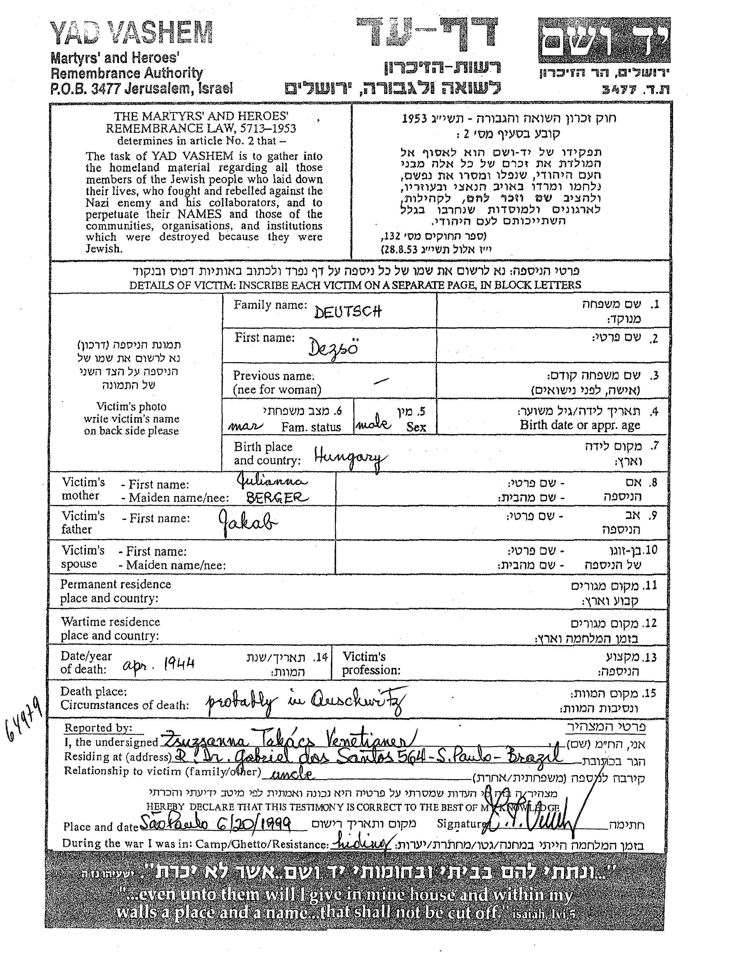 Deutsch Dezso unstated place, Page of Testimony