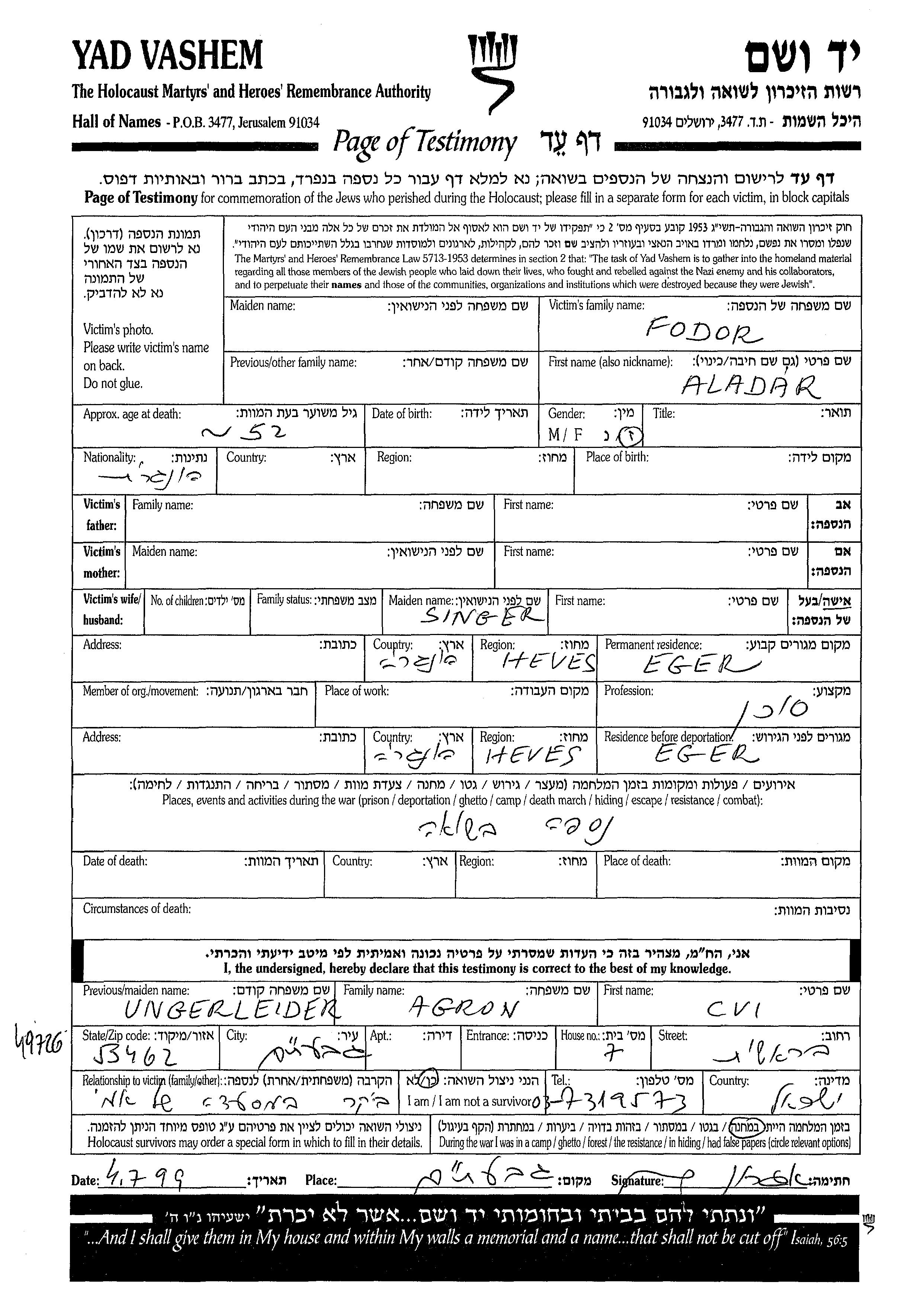 Fodor Aladar Eger, Hungary Page of Testimony