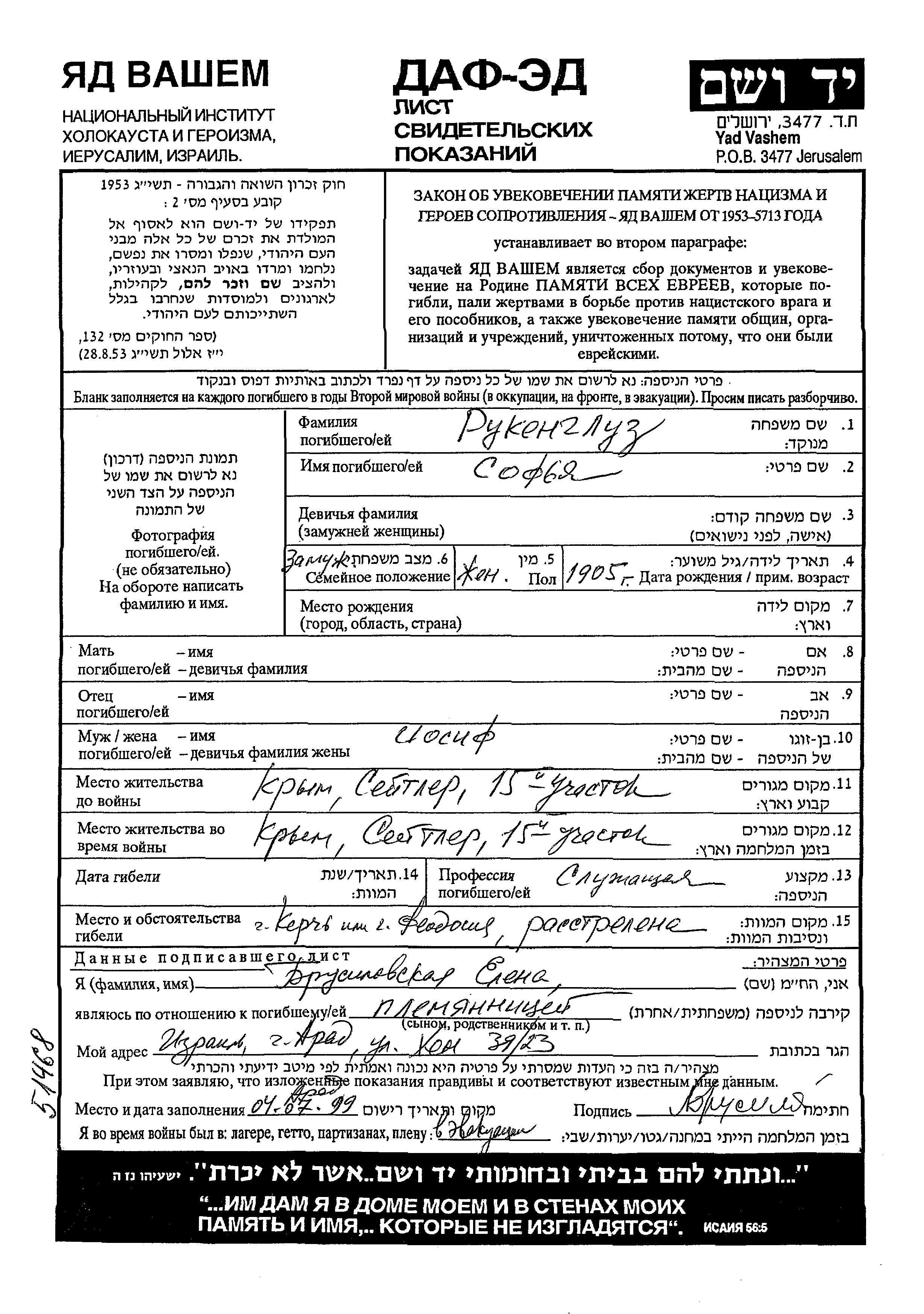 Sofya was murdered in the Shoah. Place of death: Kerch, Russia (USSR).