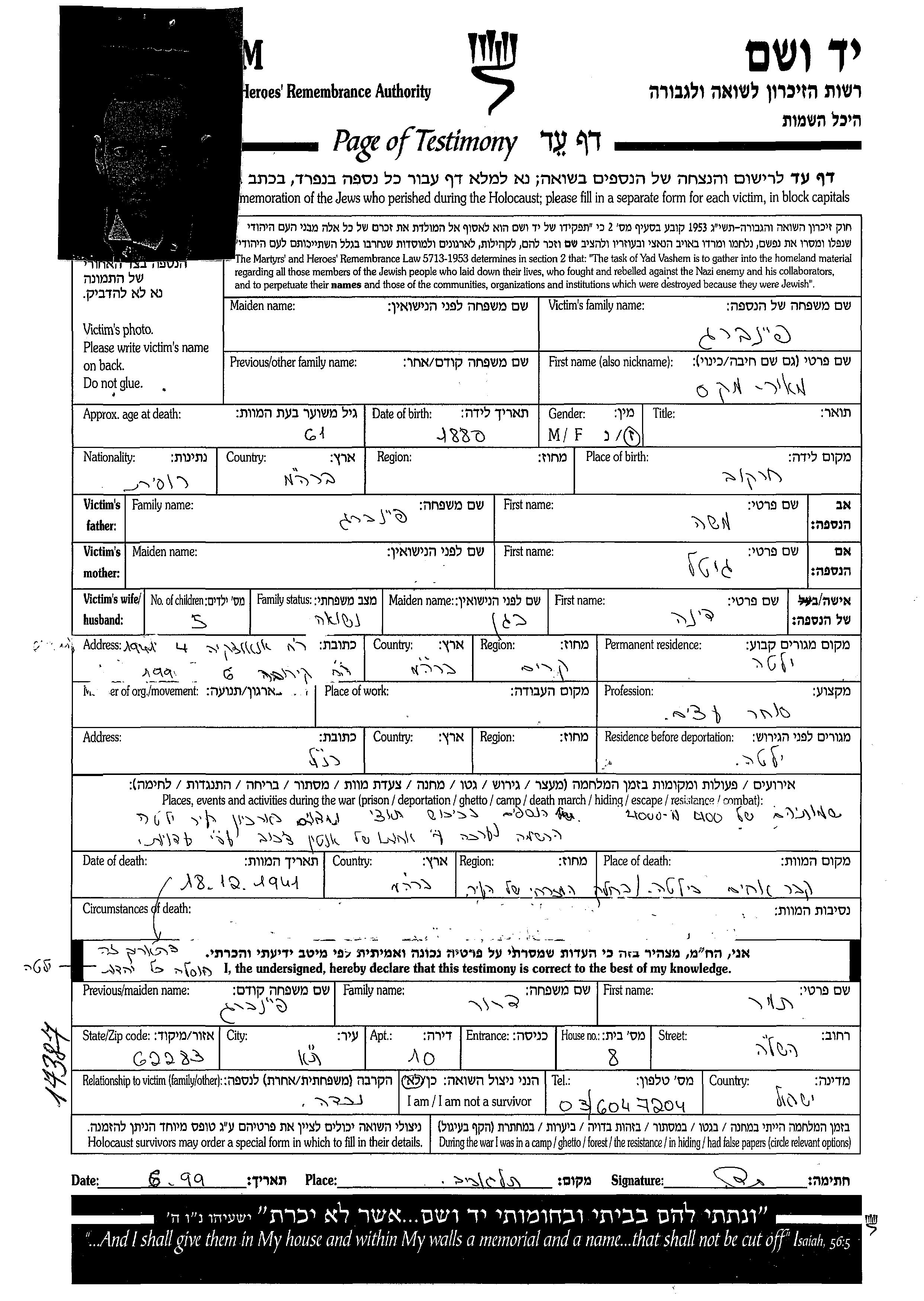 Yad Vashem - Pages of Testimony Names Memorial Collection