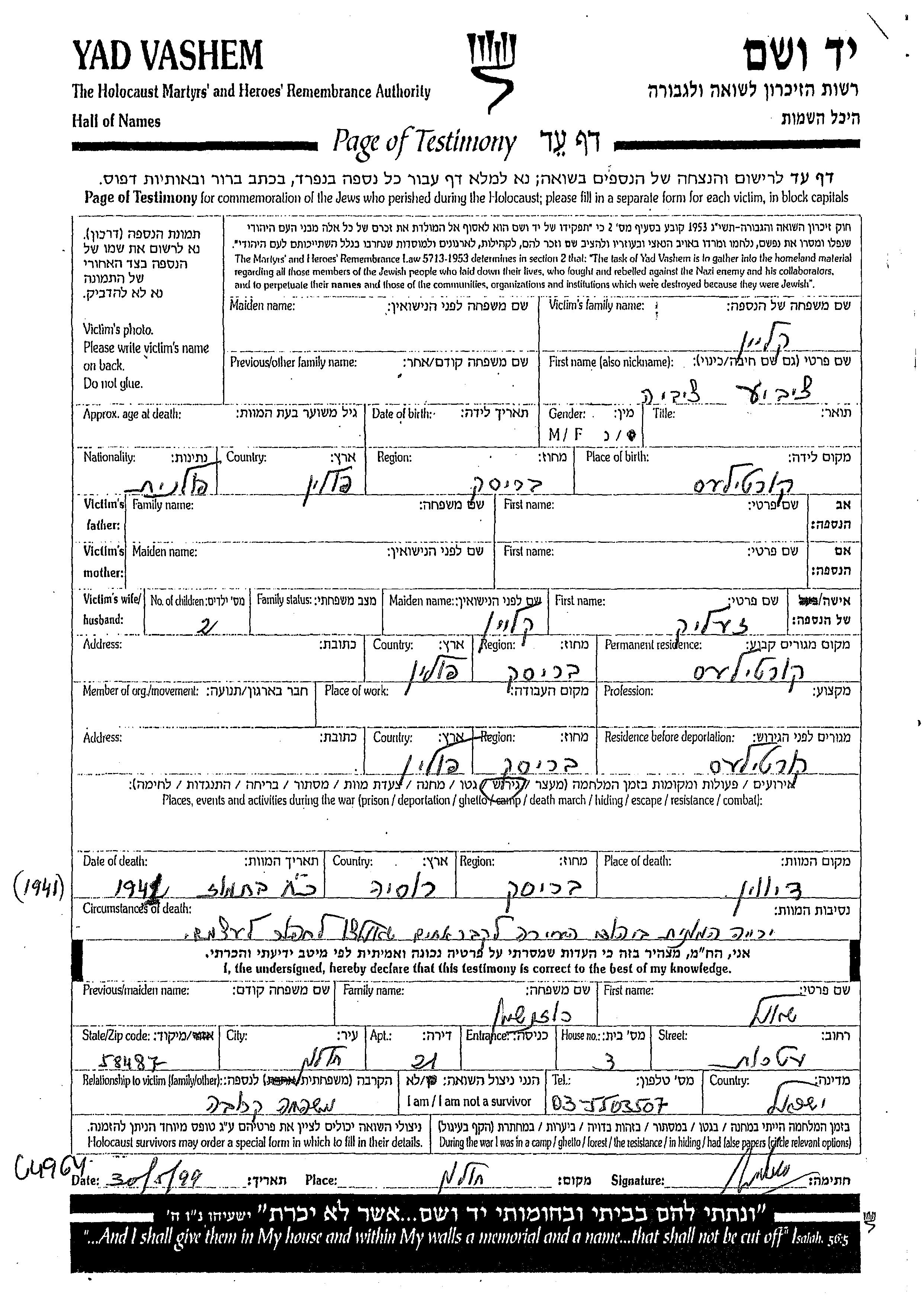 Tzivie Klein was born in Kortilas, Poland. She was married to Zelik. Prior to WWII she lived in Kortilas, Poland. During the war she was in Kortilas, Poland. Tzivie was murdered in the Shoah. Place of death: Dywin, Poland, 13/07/1942.