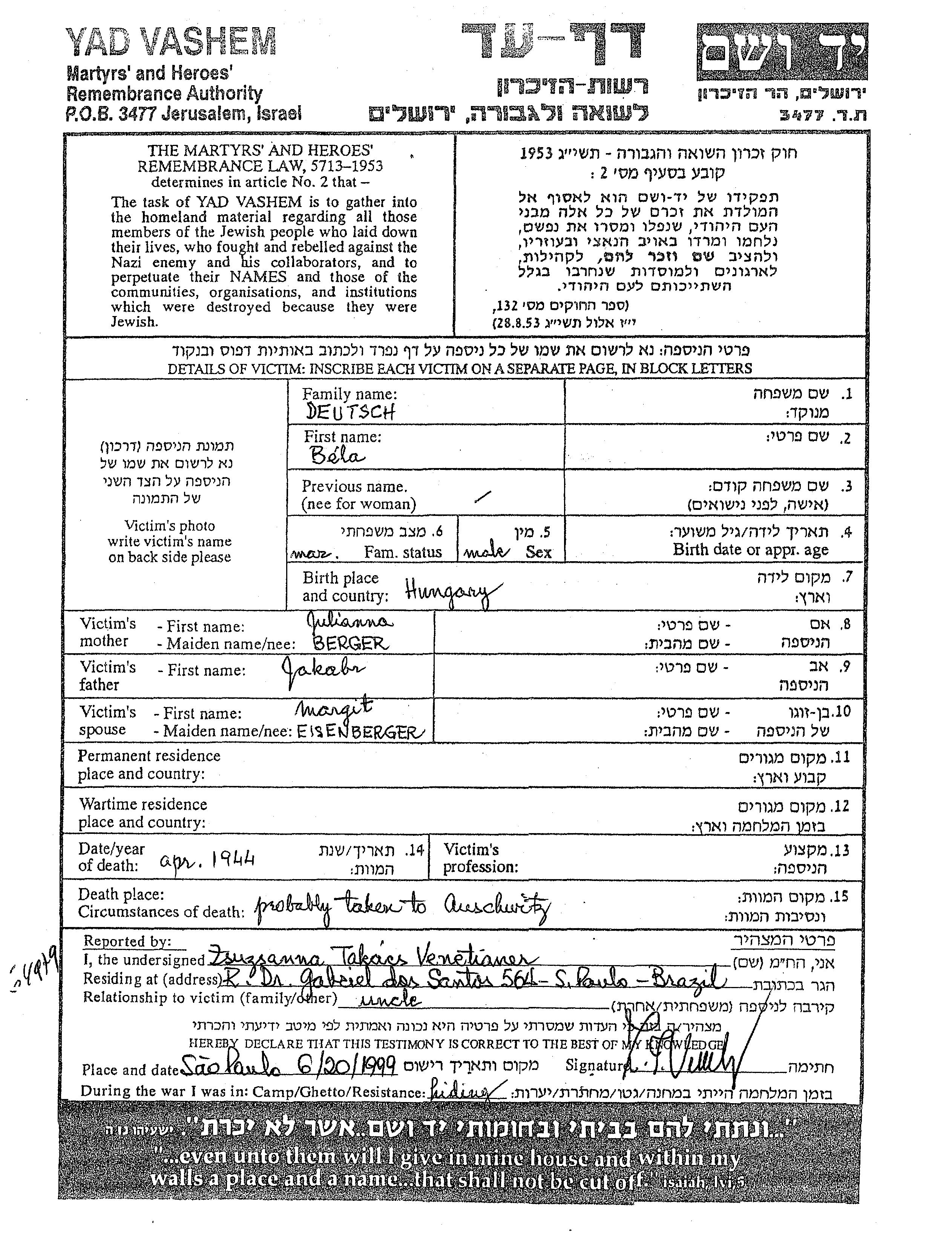Bela was murdered in the Shoah. Place of death: Auschwitz, Poland, 04/1944.