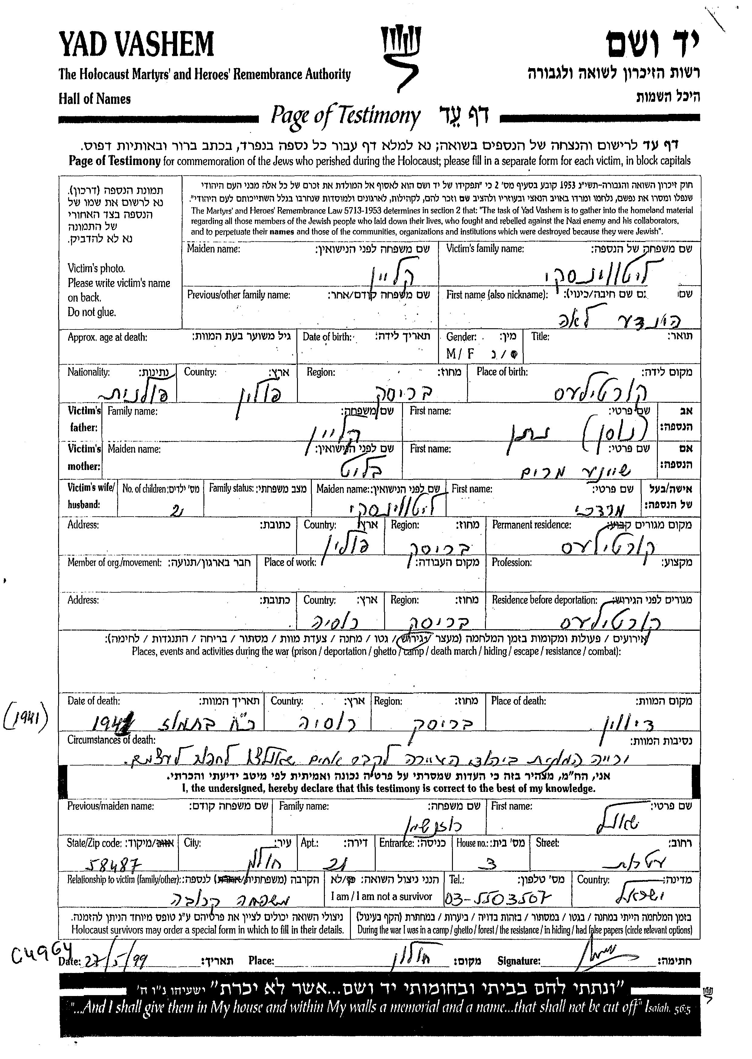 Hinde Litvinski nee Klein was born in Kortilas, Poland to Nusen and Sheine. She was married to Mordekhai. Prior to WWII she lived in Kortilas, Poland. During the war she was in Kortilas, Poland. Hinde was murdered in the Shoah. Place of death: Dywin, Poland, 23/07/1941.