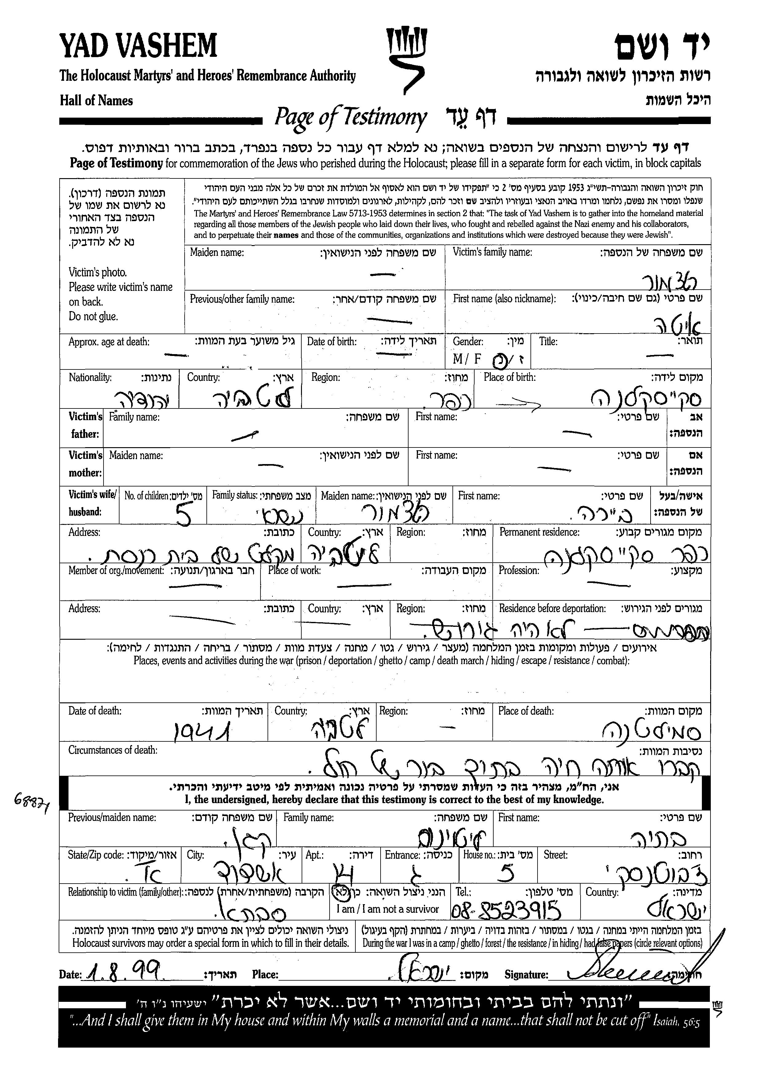 Yad Vashem - Pages of Testimony Names Memorial Collection