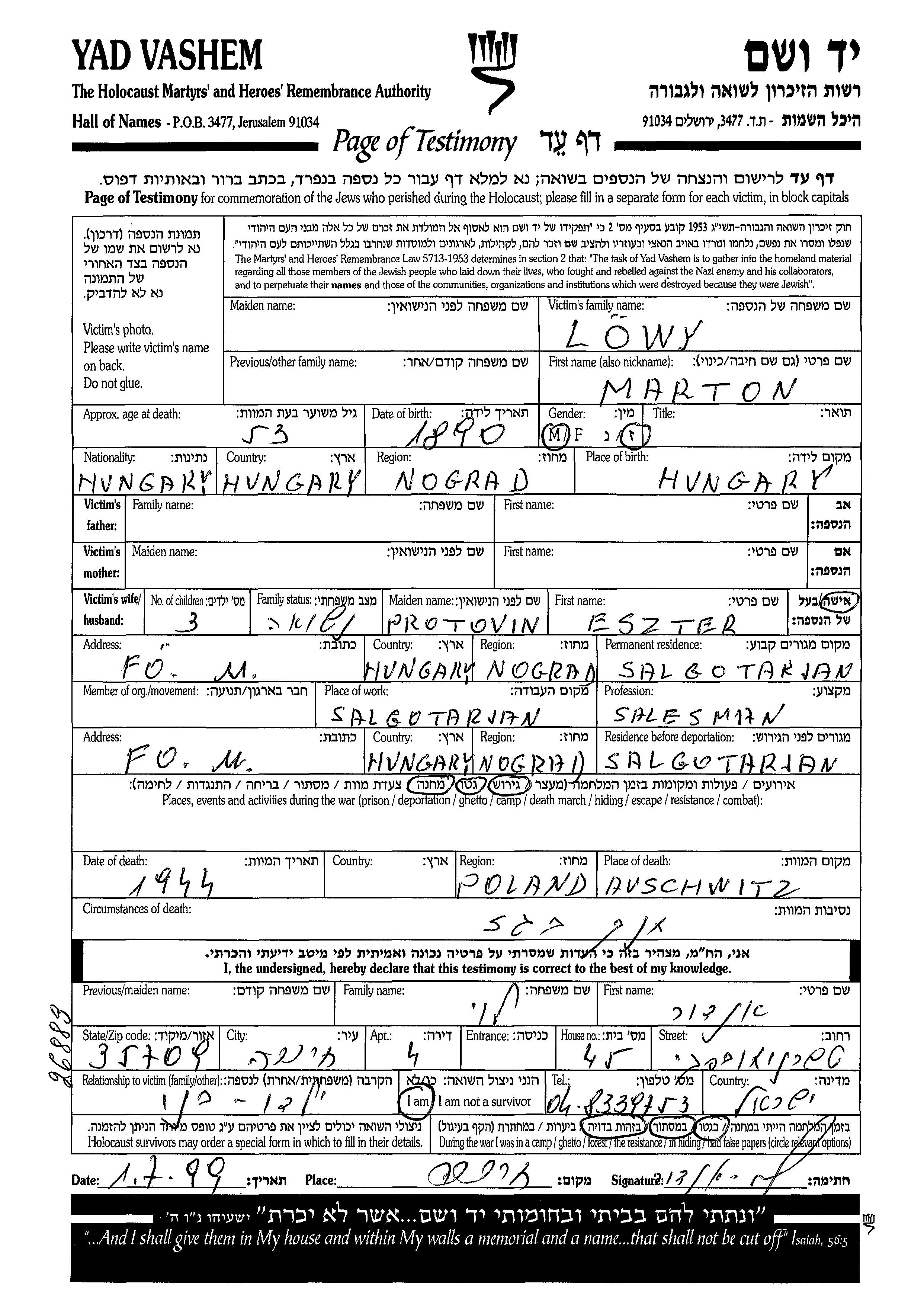 Marton Loewy was born in Nograd, Hungary, 1890. He was a salesman and married to Eszter nee Protovin. Prior to WWII he lived in Salgotarjan, Hungary. During the war he was in Salgotarjan, Hungary. Marton was murdered in the Shoah. Place of death: Auschwitz, Poland, 1944.