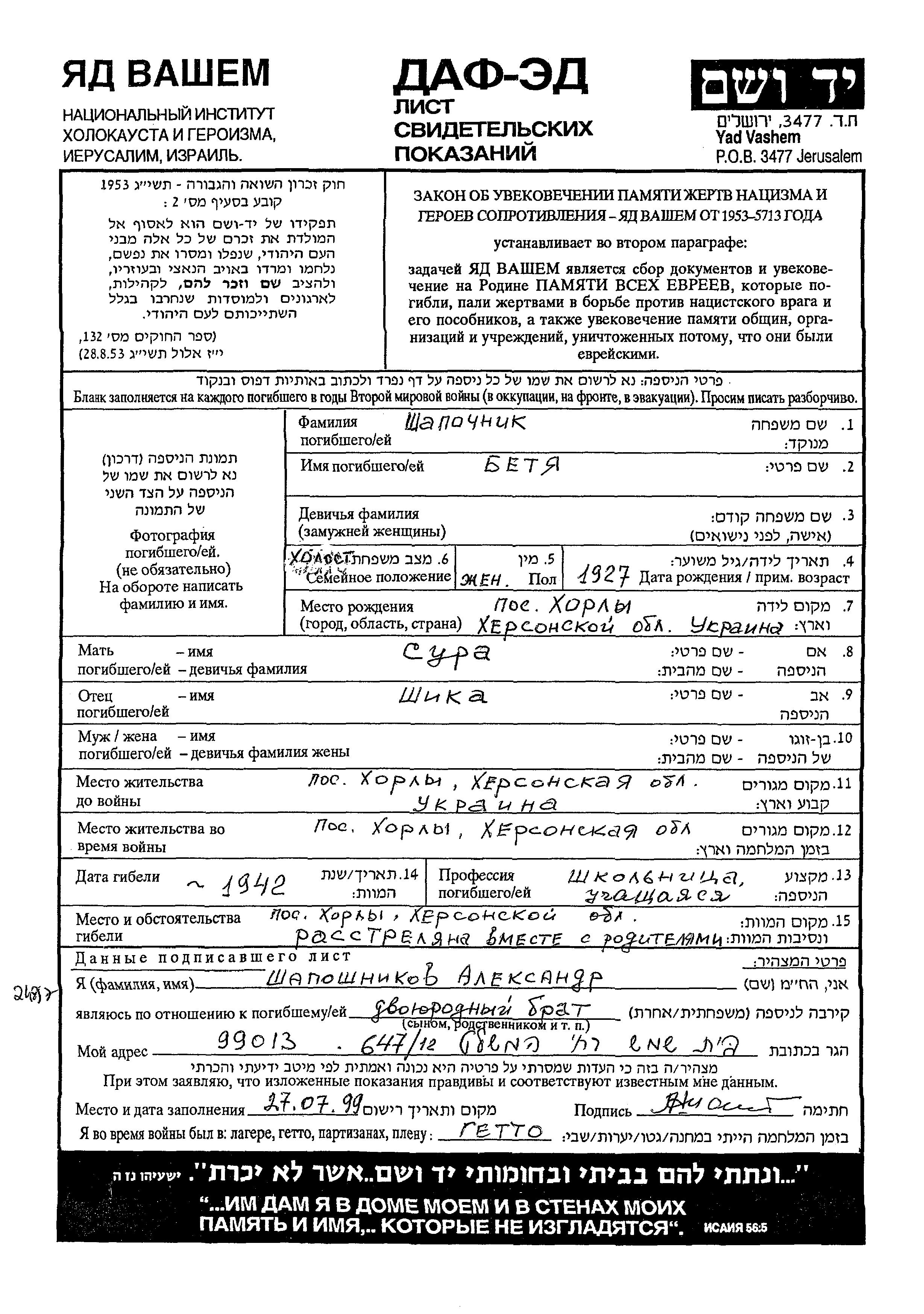 Betya Shapochnik was born in Khorli, Ukraine (USSR), 1927 to Shika and Sura. She was a pupil and single. Prior to WWII she lived in Khorli, Ukraine (USSR). During the war she was in Khorli, Ukraine (USSR). Betya was murdered in the Shoah. Place of death: Khorli, Ukraine (USSR), 1942.