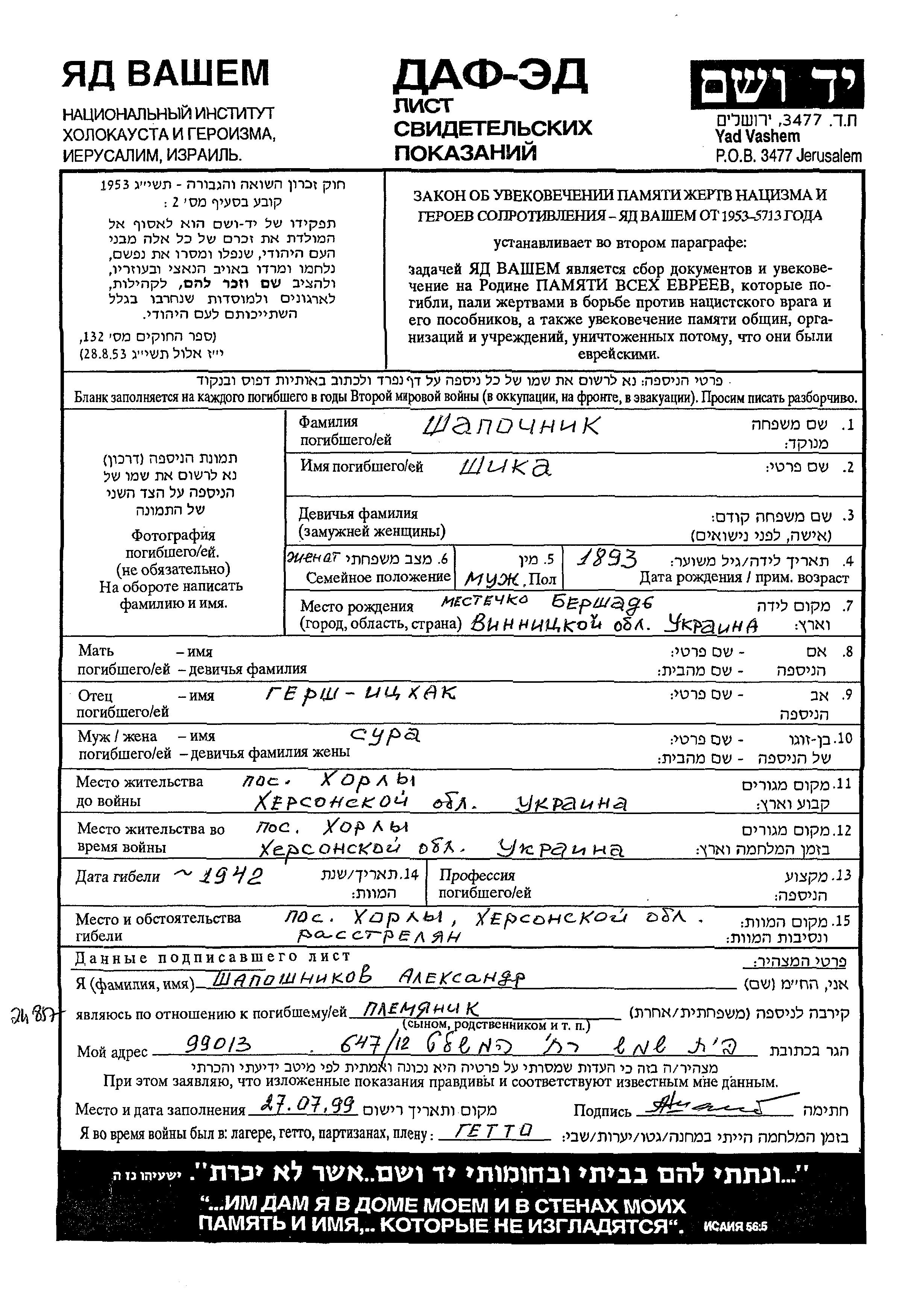 Shika Shapochnik was born in Bershad, Ukraine (USSR), 1893 to Gersh Yitzkhak. She was married to Sura. Prior to WWII she lived in Khorly, Ukraine (USSR). During the war she was in Khorly, Ukraine (USSR). Shika was murdered in the Shoah. Place of death: Khorly, Ukraine (USSR), 1942.