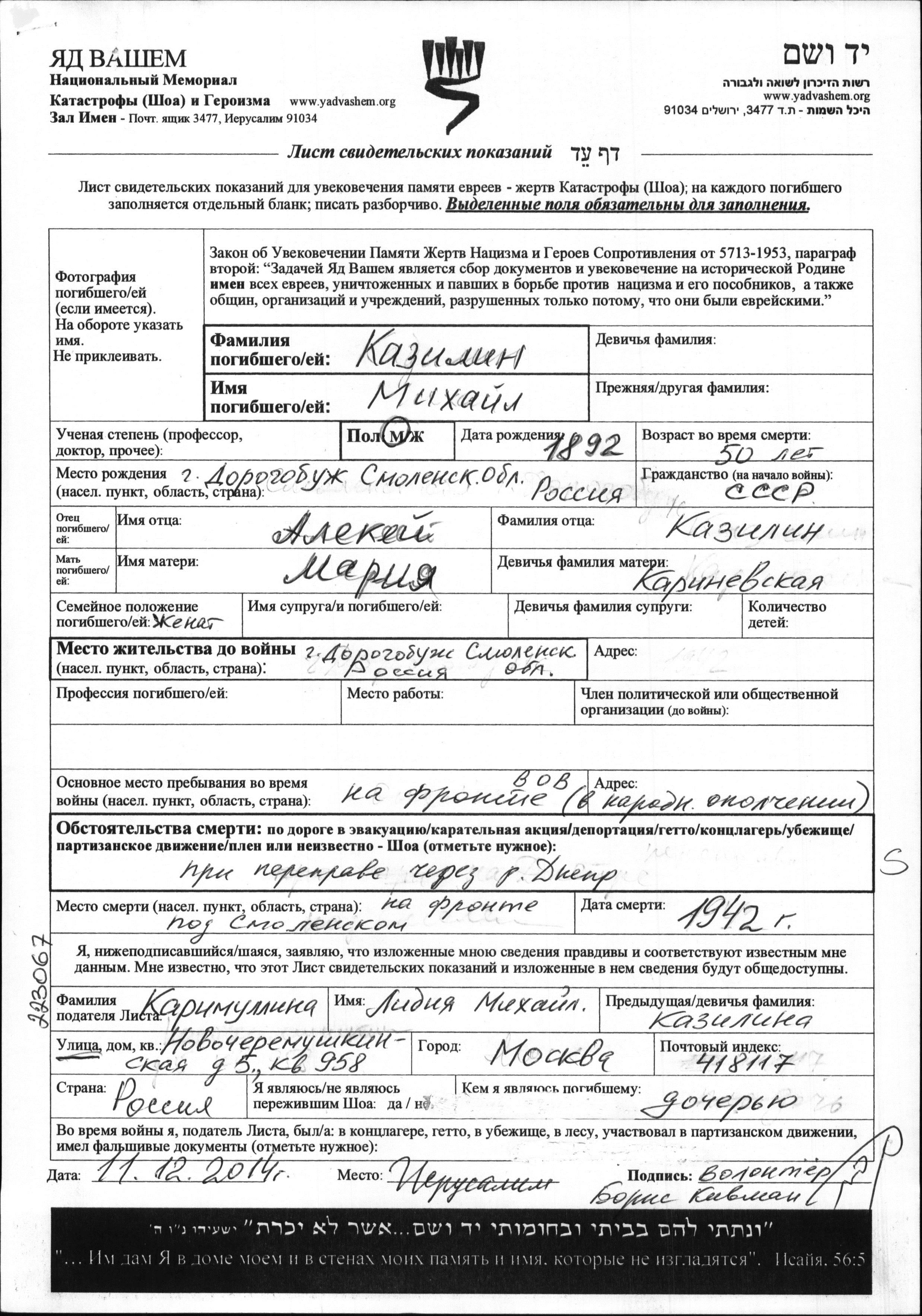Mikhail Kazilin was born in Dorogobuzh, Russia (USSR), 1892 to Aleksey and Mariya nee Karinevskaya. He was married. Prior to WWII he lived in Dorogobuzh, Russia (USSR). During the war he was in Dorogobuzh, Russia (USSR). Mikhail was killed in military service in WWII. Place of death: unknown, 1942.