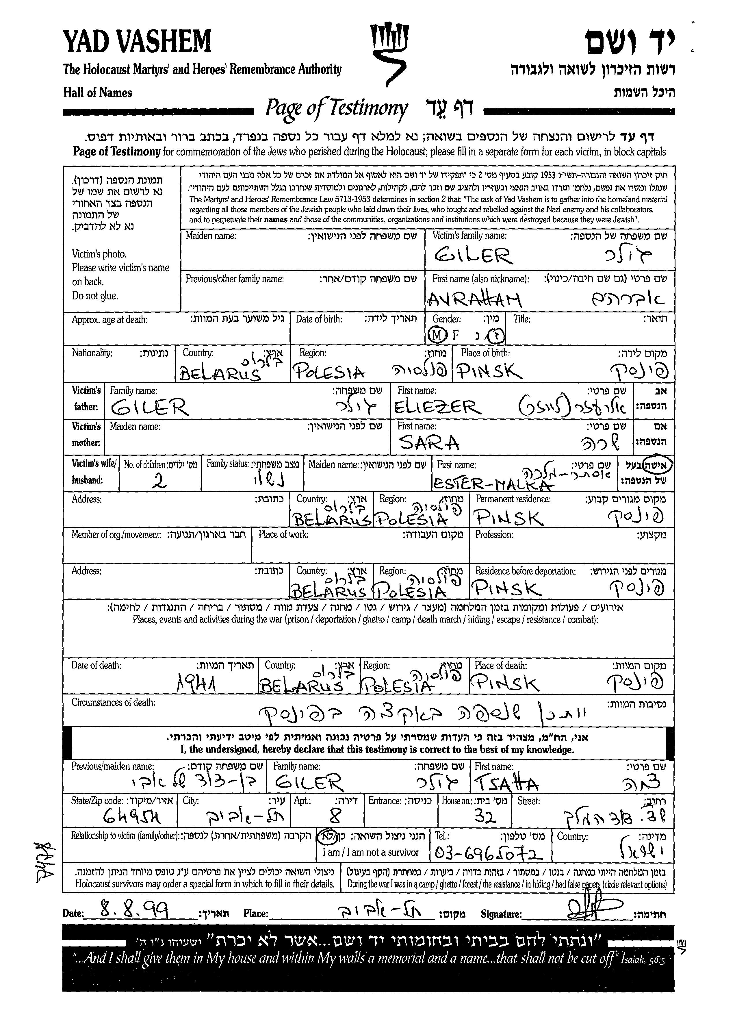 Avraham Giler was born in Pisk, Poland to Eliezer and Sara. He was married to Ester Malka. Prior to WWII he lived in Pisk, Poland. During the war he was in Pisk, Poland. Avraham was murdered in the Shoah. Place of death: Pisk, Poland, 1941.