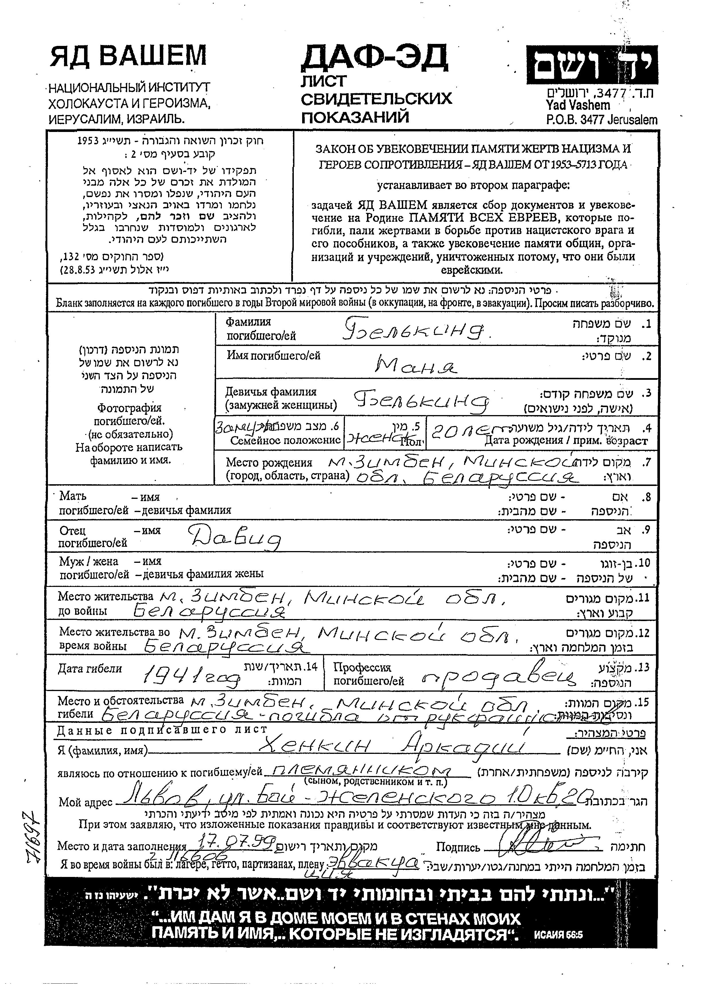 Belkind Manya Zembin, Belorussia (USSR) Page of Testimony