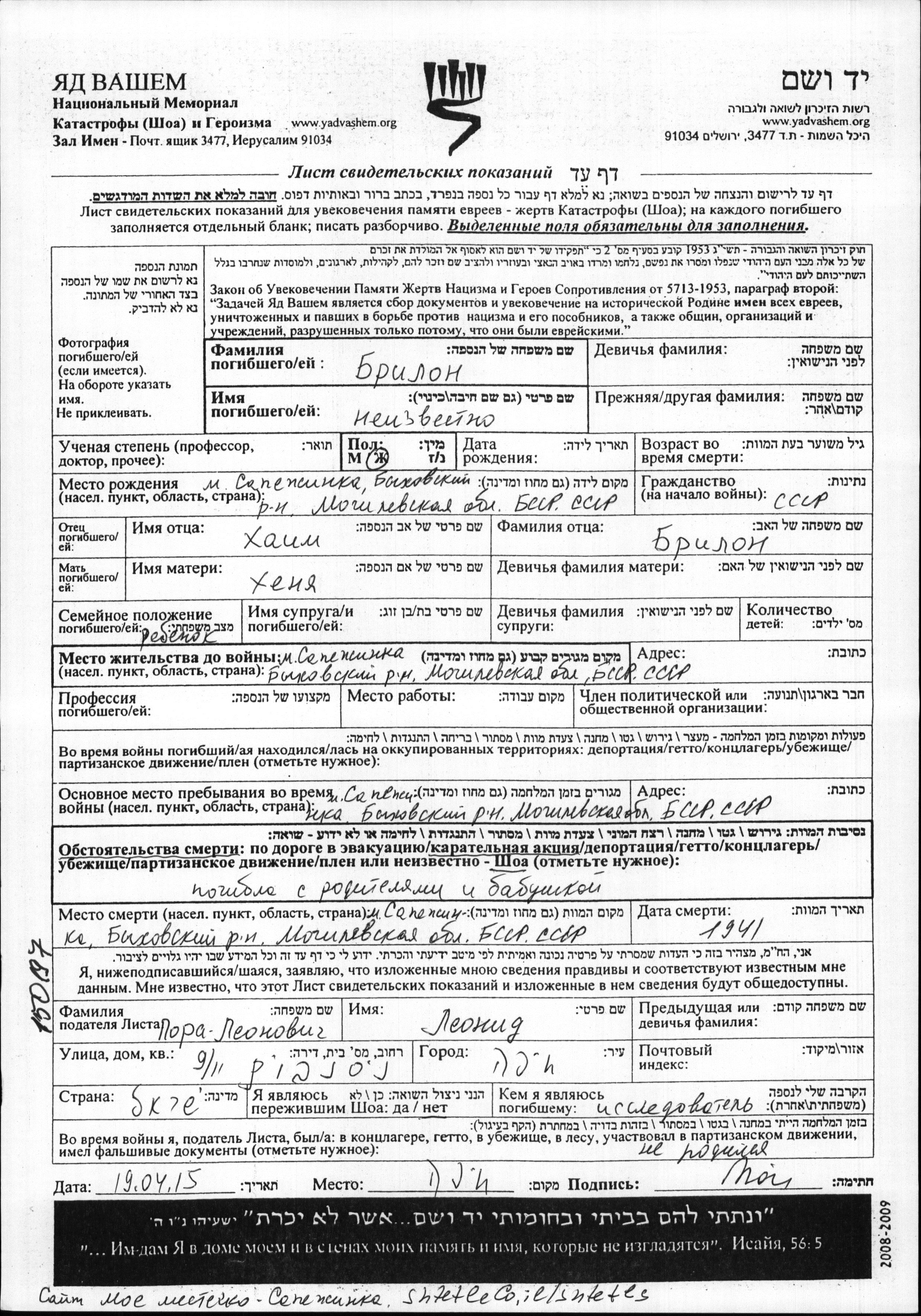 First name unknown Brilon was born in Sapezhinka, Belorussia (USSR) to Khayim and Khenya. She was child. Prior to WWII she lived in Sapezhinka, Belorussia (USSR). During the war she was in Sapezhinka, Belorussia (USSR). She was murdered in the Shoah. Place of death: Sapezhinka, Belorussia (USSR), 1941.