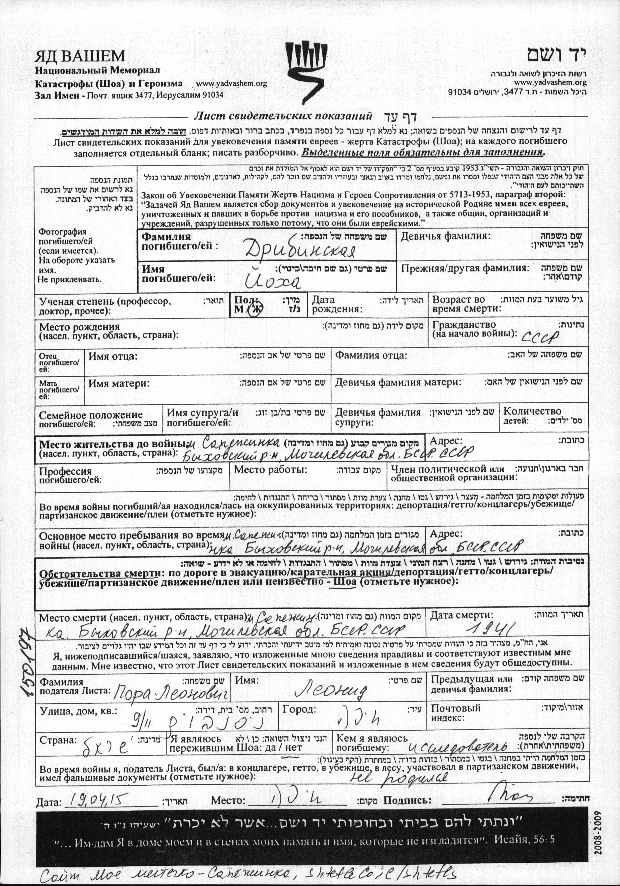 Yokha Dribinskaya. Prior to WWII she lived in Sapezhinka, Belorussia (USSR). During the war she was in Sapezhinka, Belorussia (USSR). Yokha was murdered in the Shoah. Place of death: Sapezhinka, Belorussia (USSR), 1941.