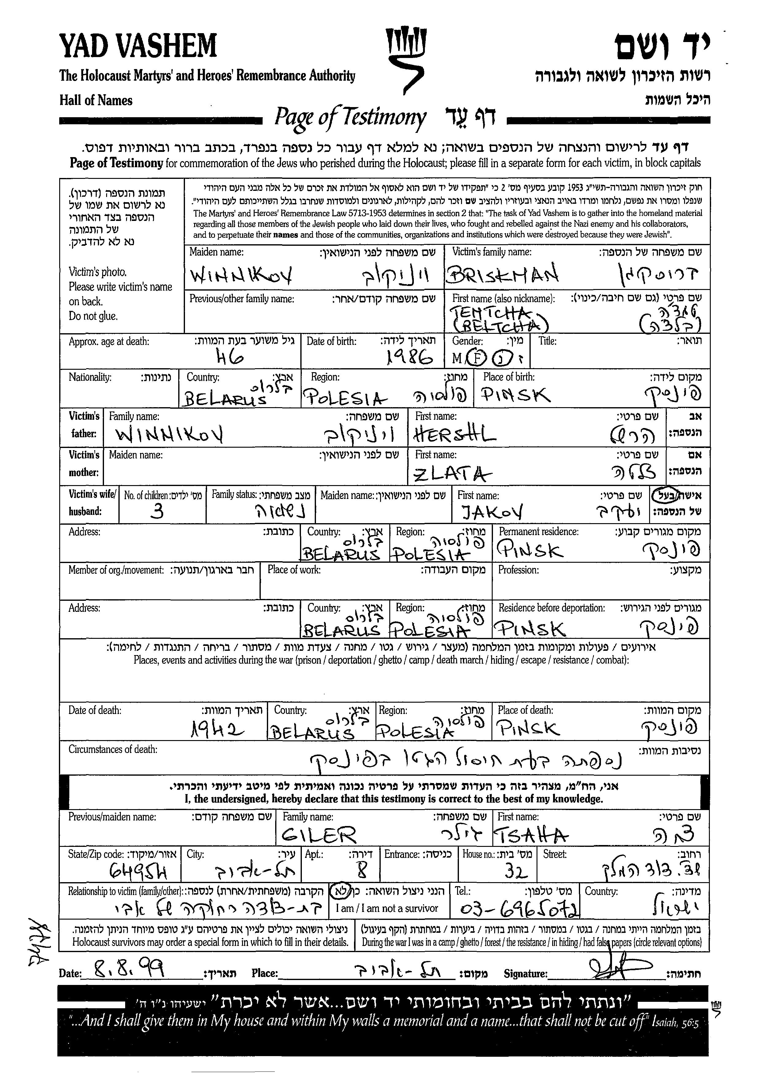 Temtcha Beltcha Briskman nee Winnikov was born in Pinsk, Poland, 1886 to Hershl and Zlata. She was married to Jakov. Prior to WWII she lived in Pinsk, Poland. During the war she was in Pinsk, Poland. Temtcha Beltcha was murdered in the Shoah. Place of death: Pinsk, Poland, 1942.