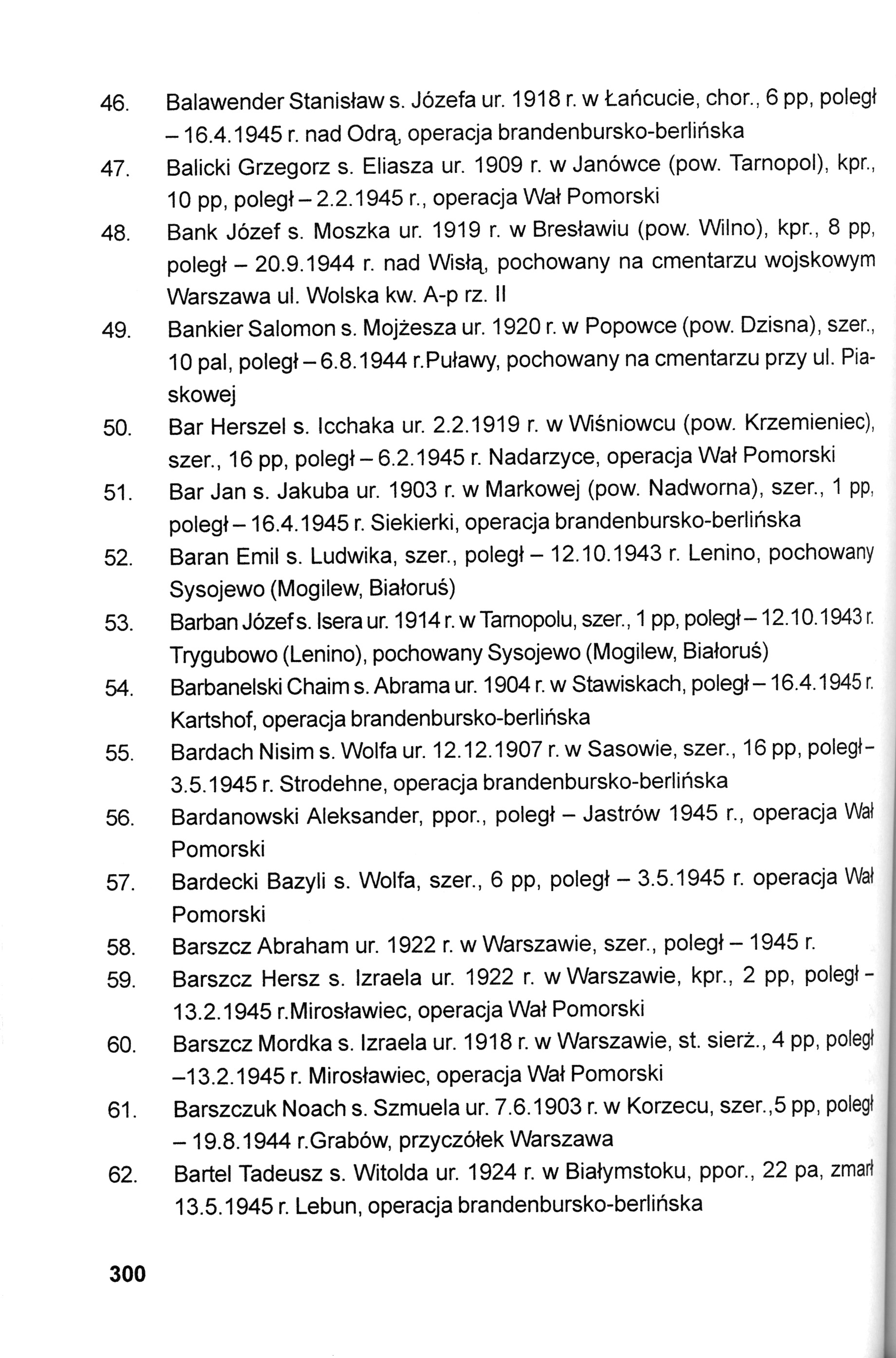Sergeant Jakub Bar was born in Markowa, Poland, 1903. During the war he was in the Polish armed forces. Sergeant Bar was killed in military service in WWII. Place of death: Siekierki, Germany, 16/04/1945.